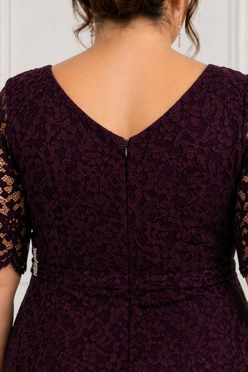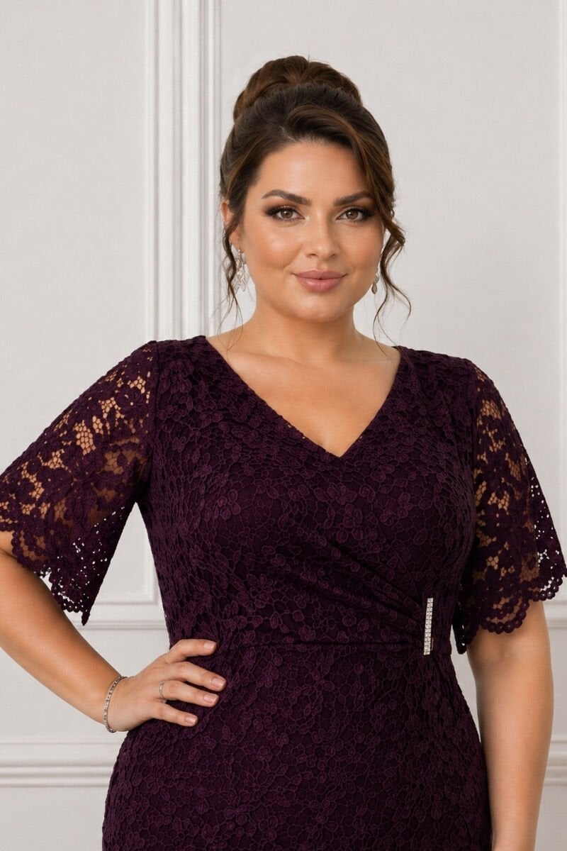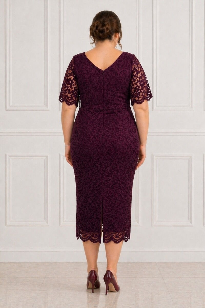 Büyük Beden Mürdüm Dantel Abiye Elbise V Yaka Taş Detay Midi Boy Şık Davet Elbisesi 52