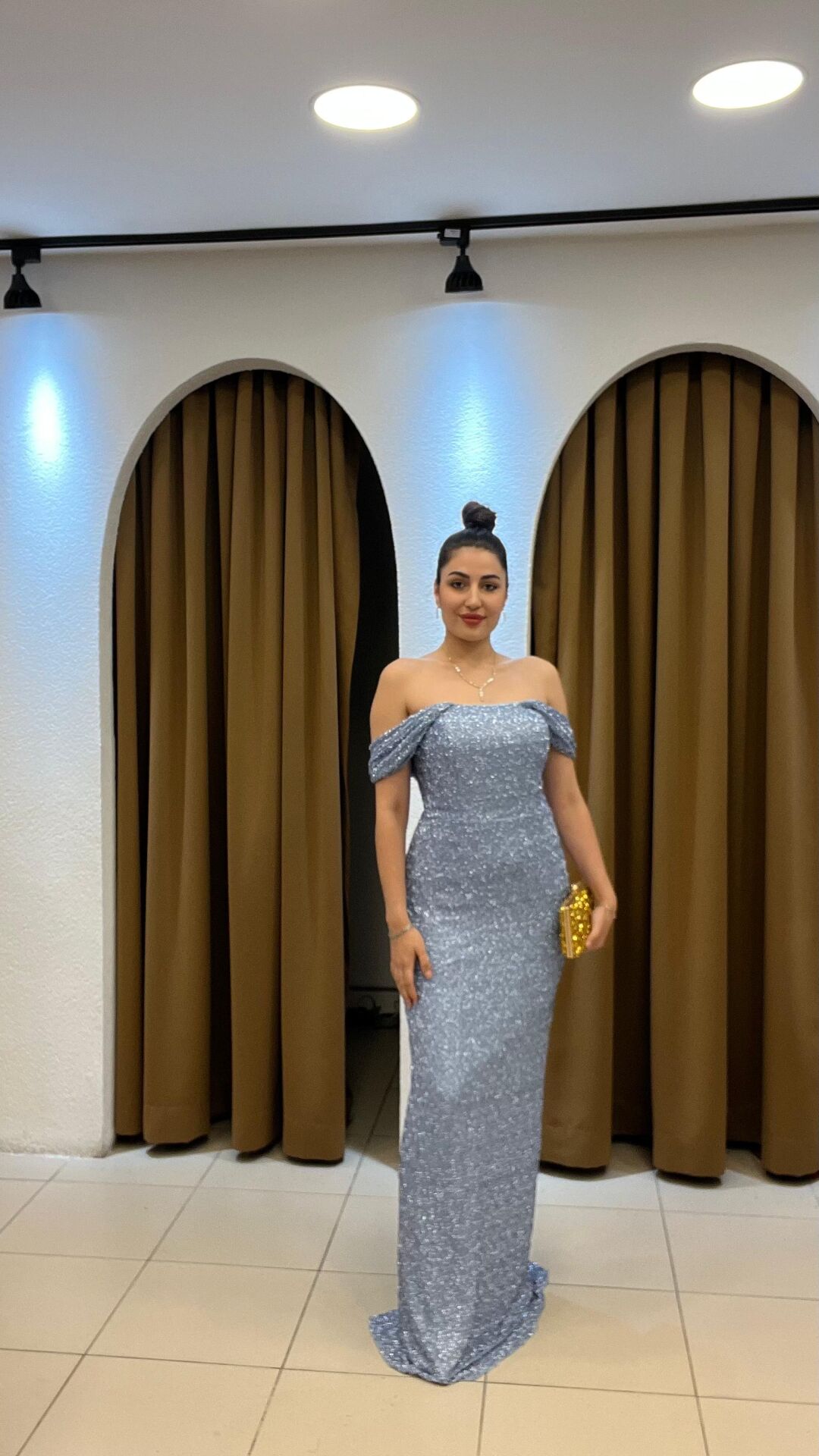 Zarafetin ve şıklığın buluştuğu Bebe Mavisi Madonna Yaka Pullu Arkadan Yırtmaçlı Abiye, özel davetlerde göz kamaştırmak isteyenler için tasarlandı. Bebe mavisi tonunun soft ve zarif dokusu, Madonna yaka detayı ile birleşerek sofistike bir görünüm sunuyor. Elbisenin tamamını kaplayan ışıltılı pullar, her adımda dikkat çekici bir parlaklık sağlarken, arkadaki zarif yırtmaç detayı hareket özgürlüğü ve modern bir dokunuş katıyor.