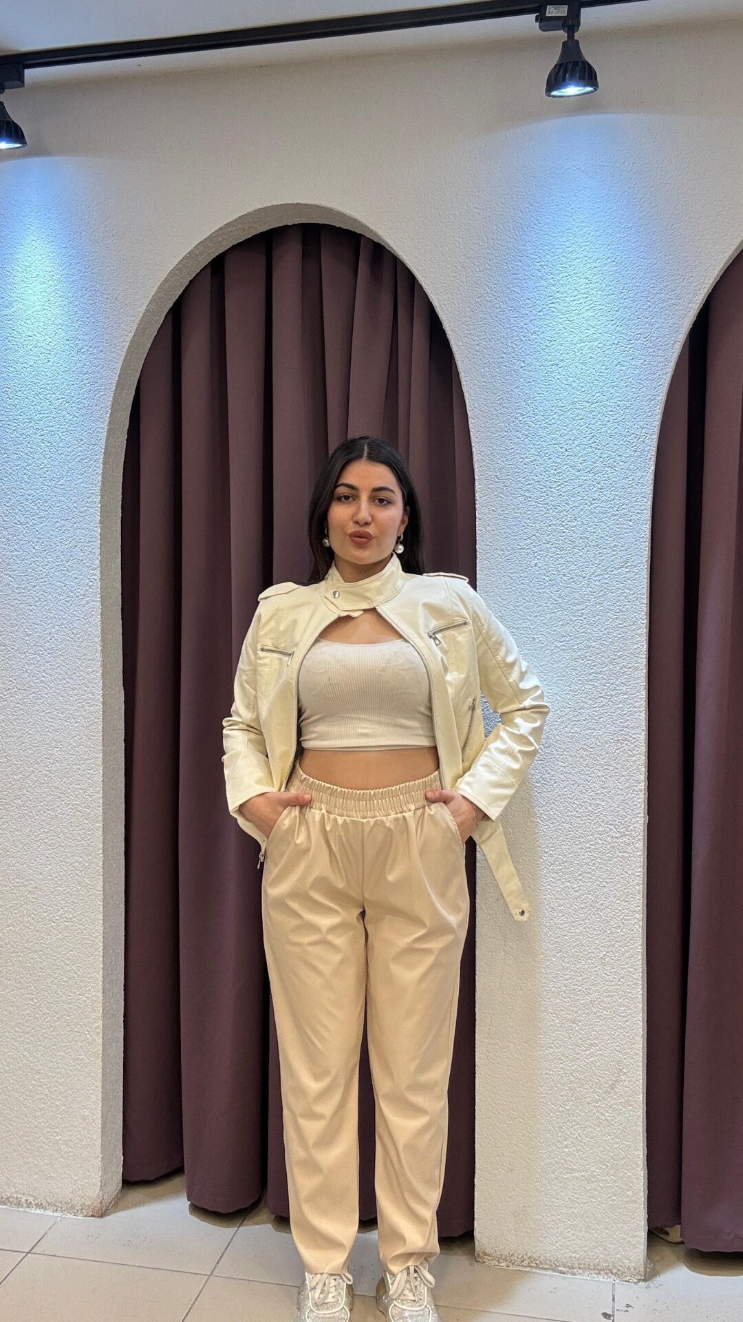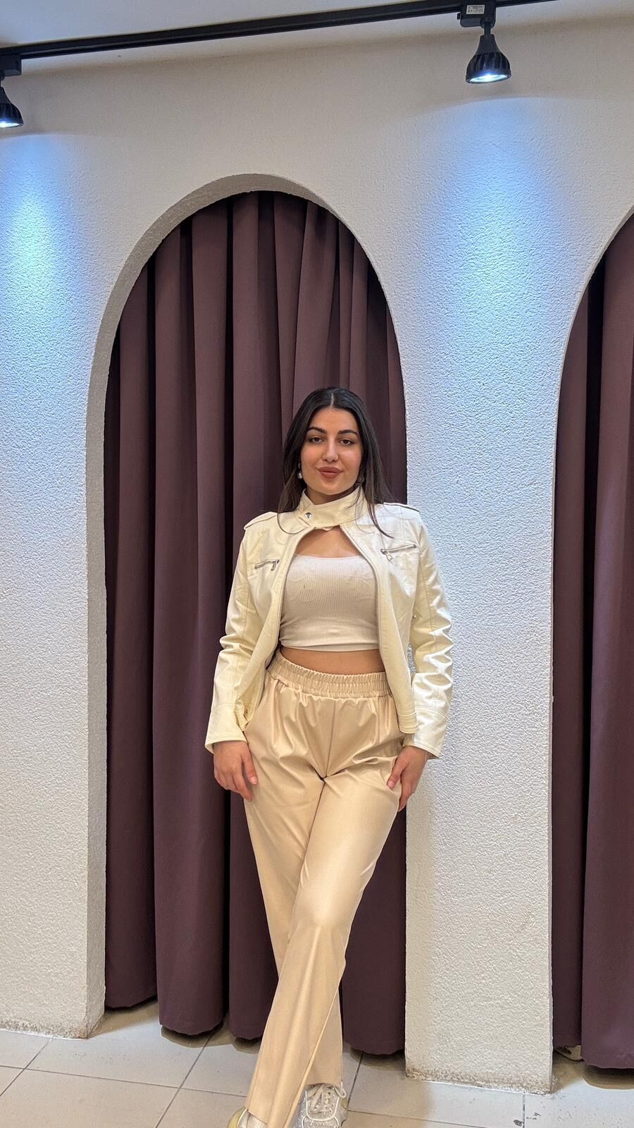 BEJ BELLİ LASTİKLİ DERİ PANTOLON