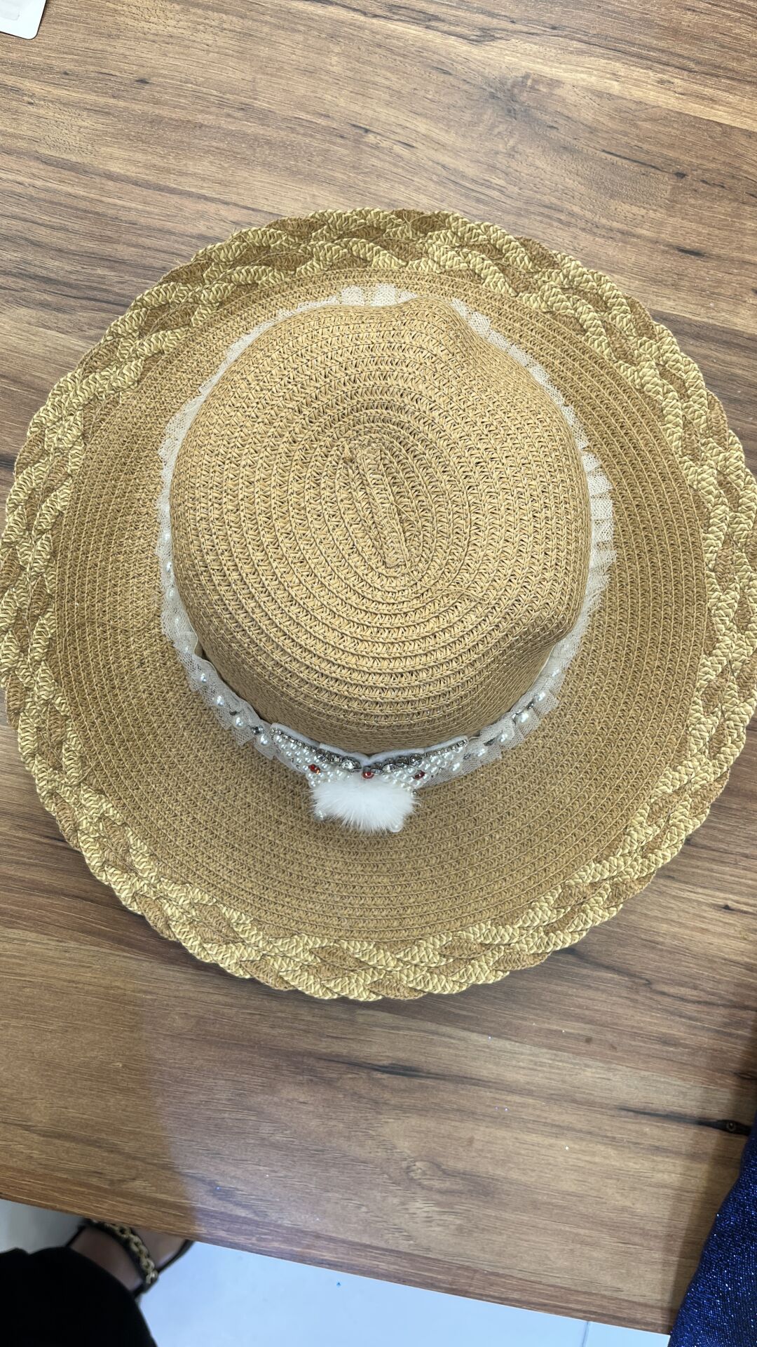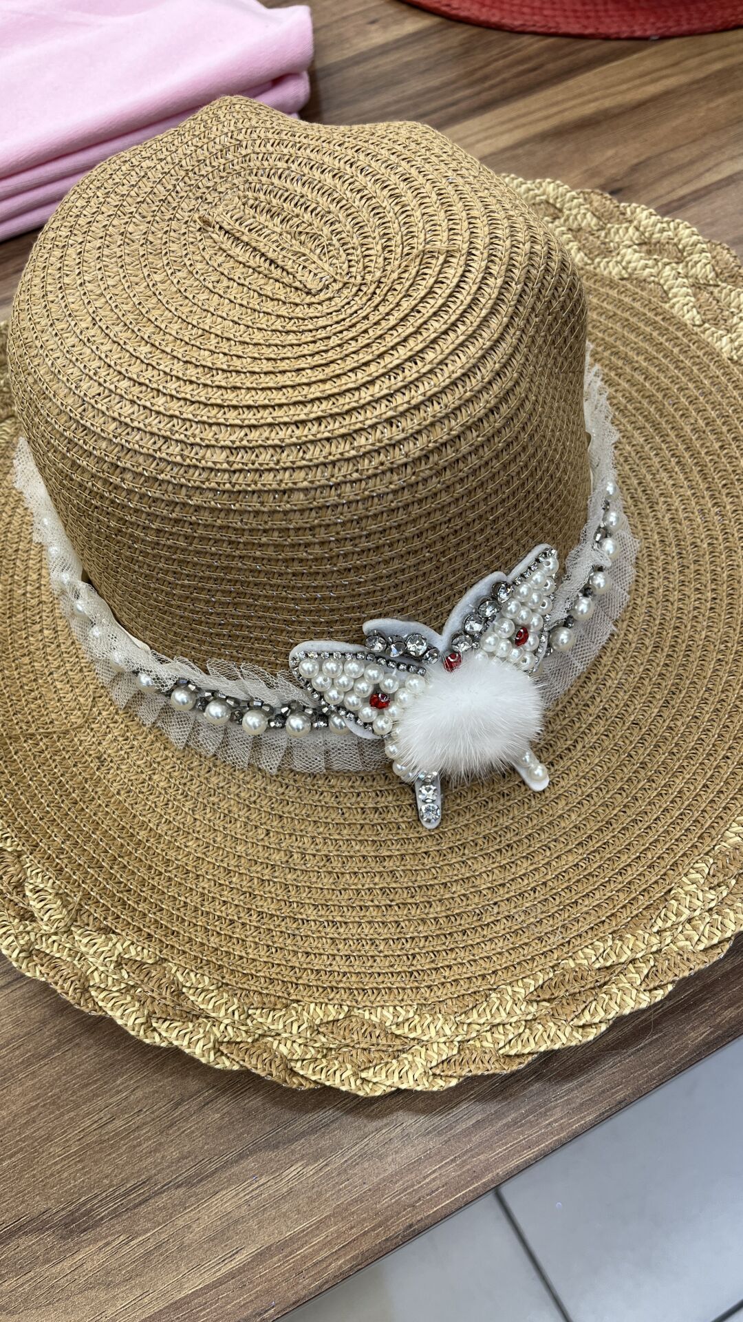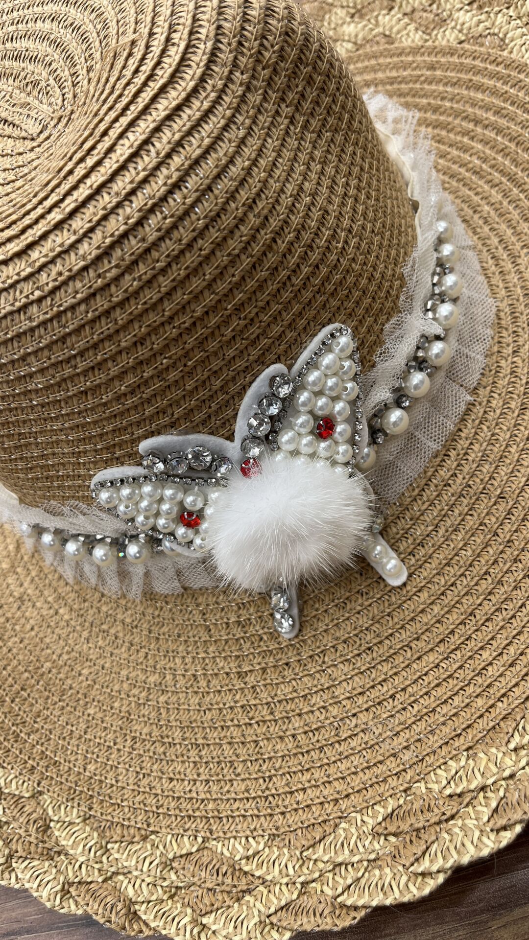 - Detaylar: Beyaz dantel şerit ve kelebek şeklinde kristal taşlı, inci ve kürklü bir süsleme ile detaylandırılmış. Alt kenarda altın renkli bir örme detay var.