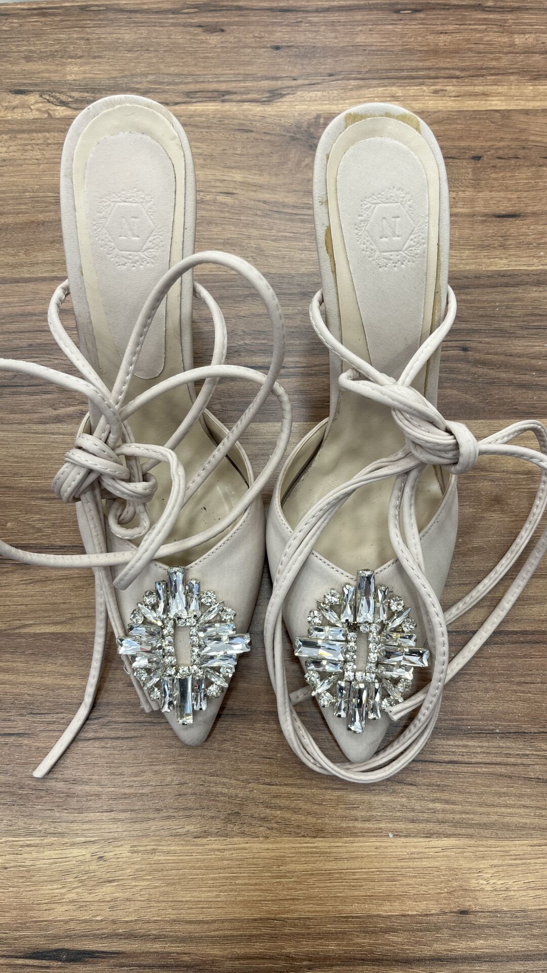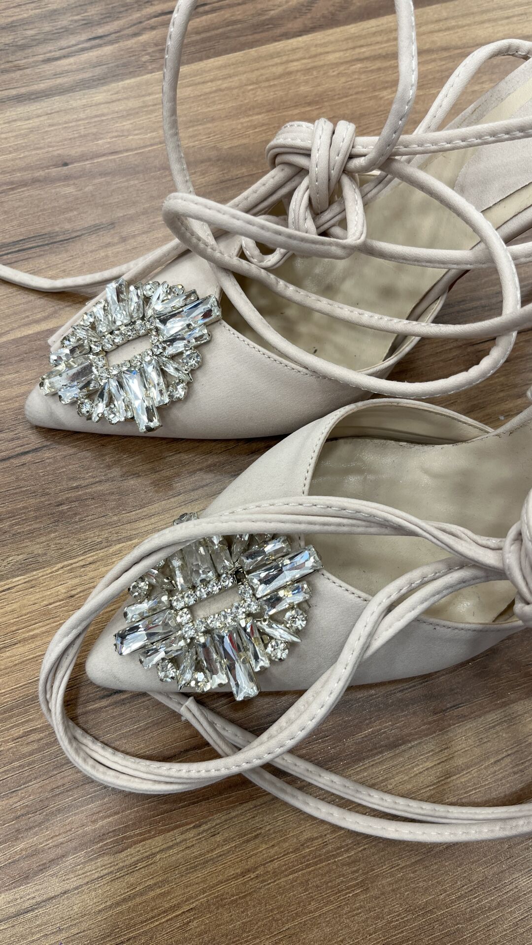 - Tasarım: Açık burunlu, bağcıklarla bileğe kadar uzanan zarif bir model. Bağcıkların üzerinde büyük taş süslemeler var.