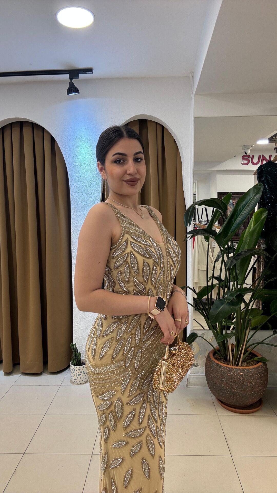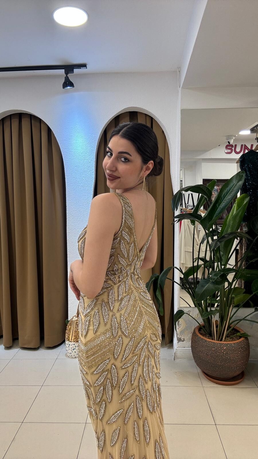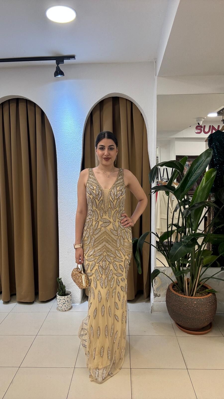 El işlemeli sırtı V yaka balık model kuyruklu abiye boncuk işleme