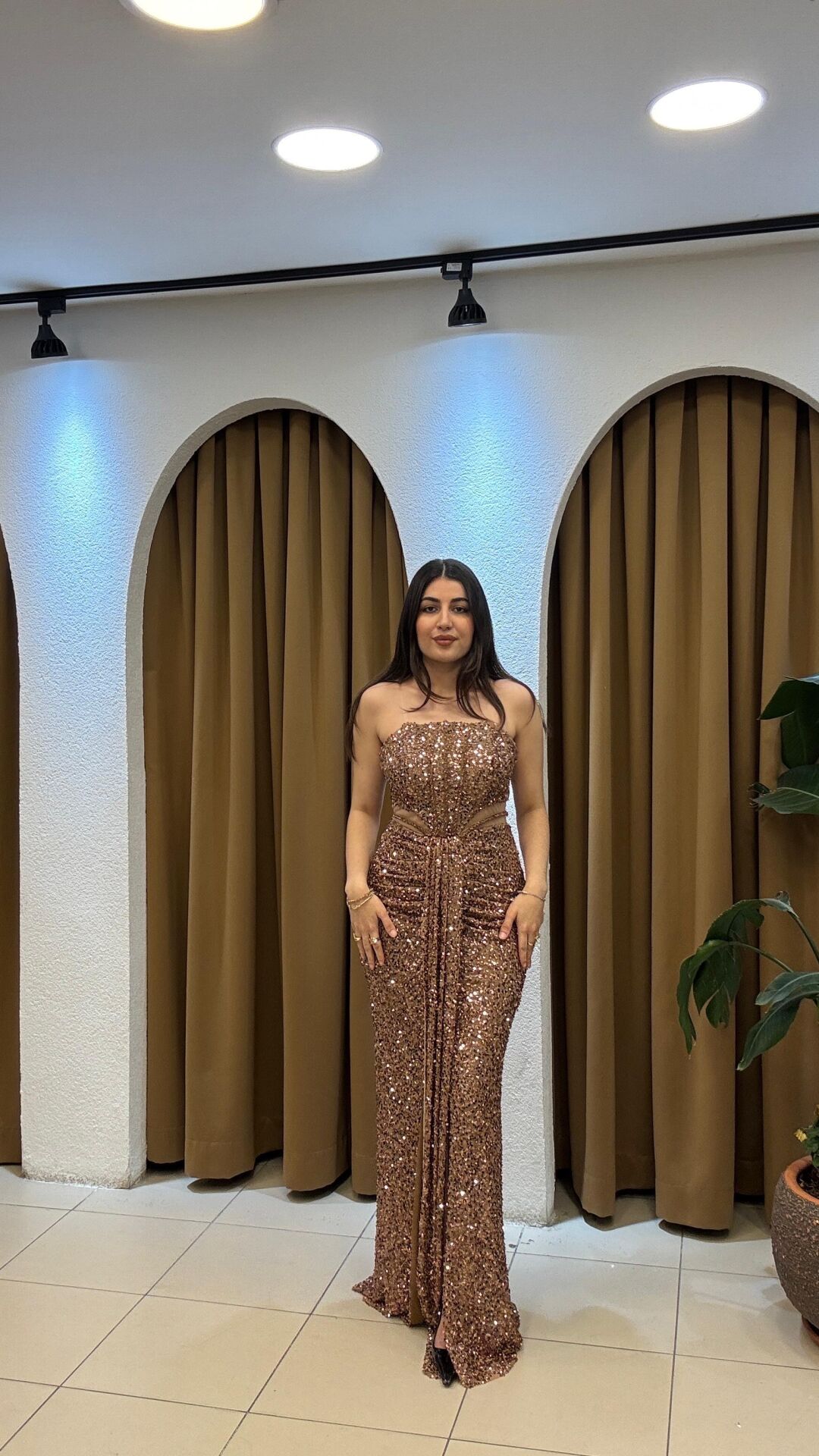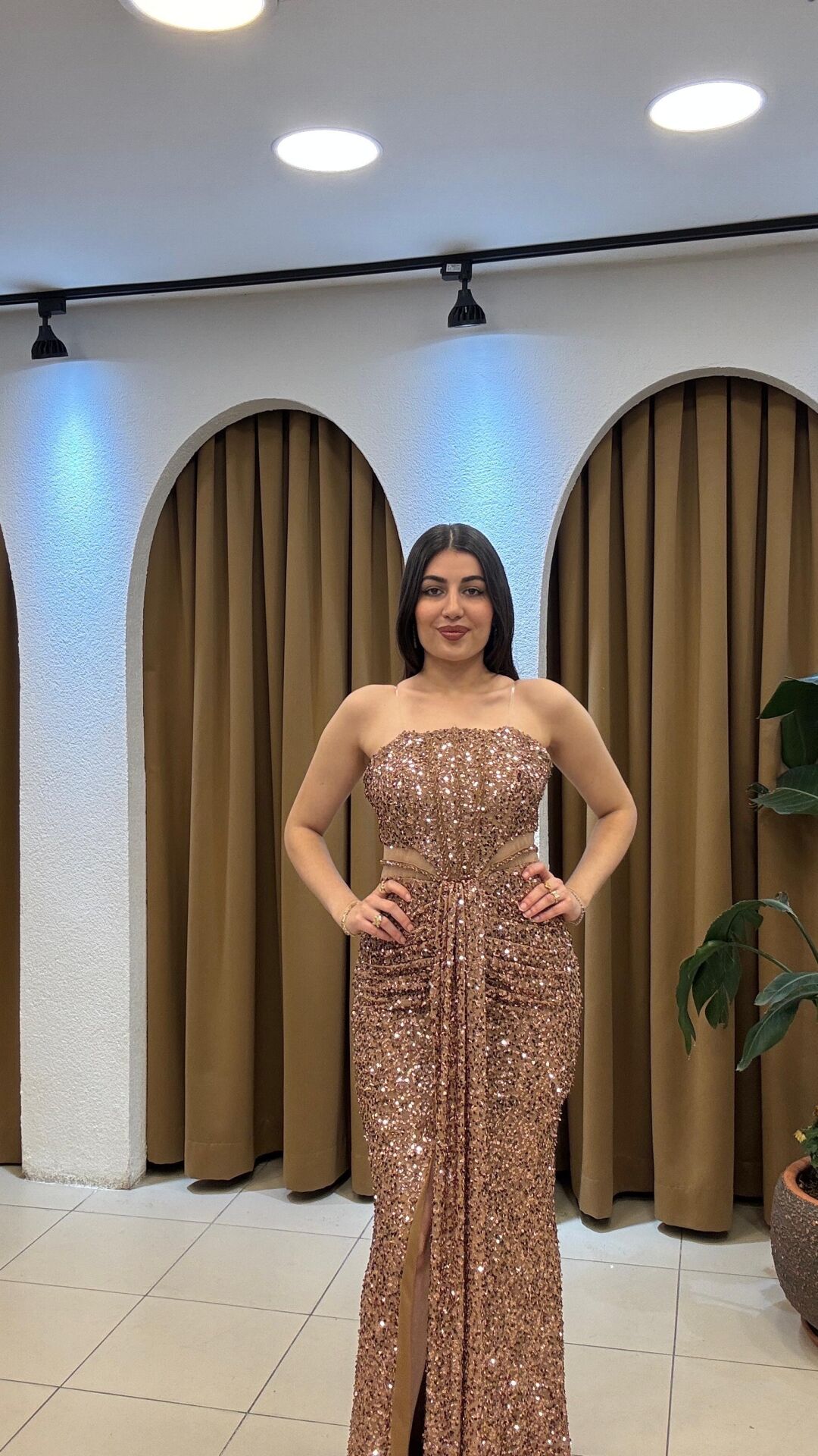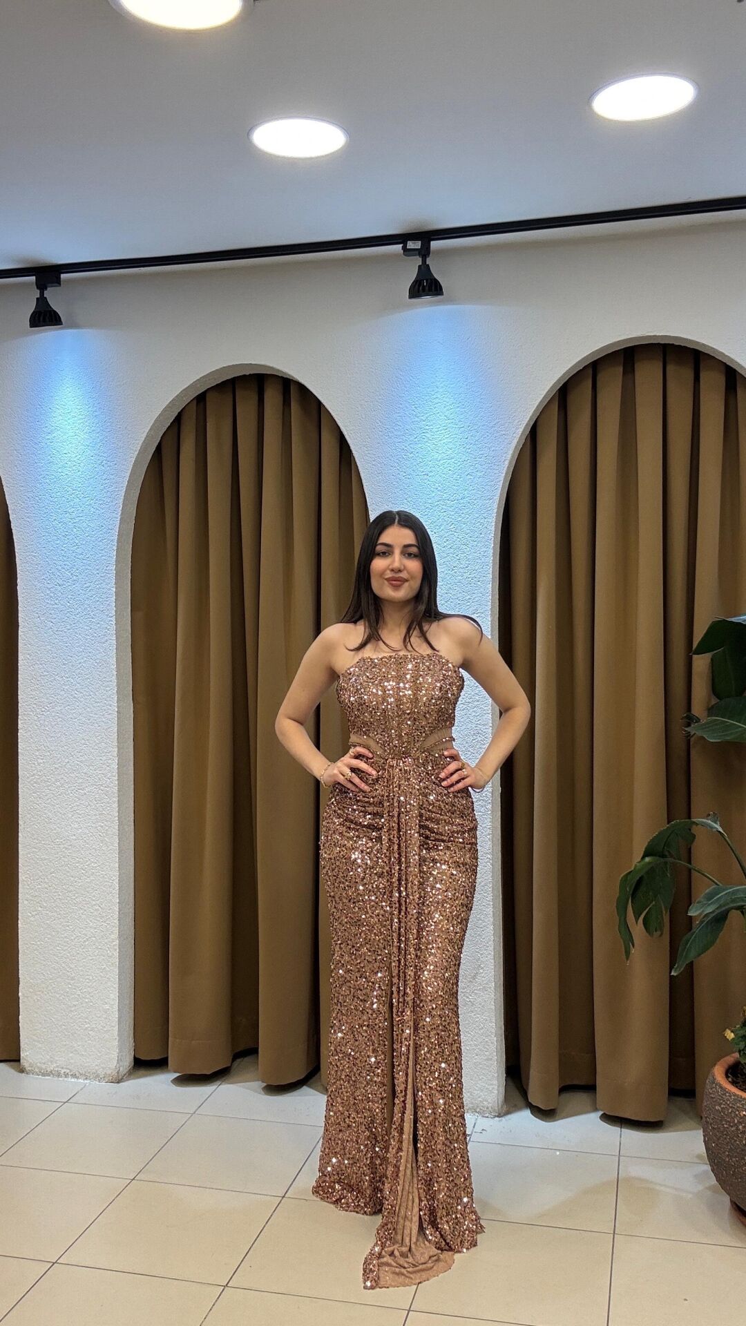 Gold Straplez önden kuyruklu uzun payetli abiye
