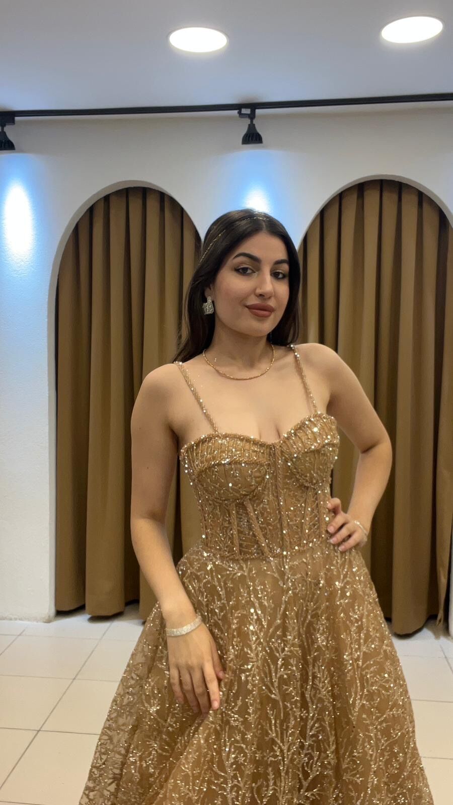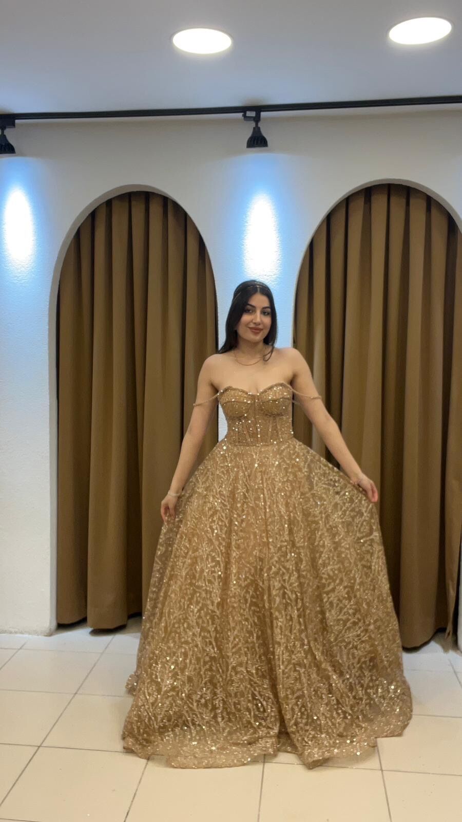Işıltılı altın tonlarında şık korsaj detayı volümlü etek kabarık abiye elbise