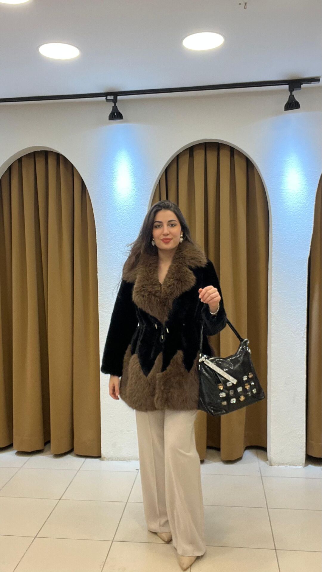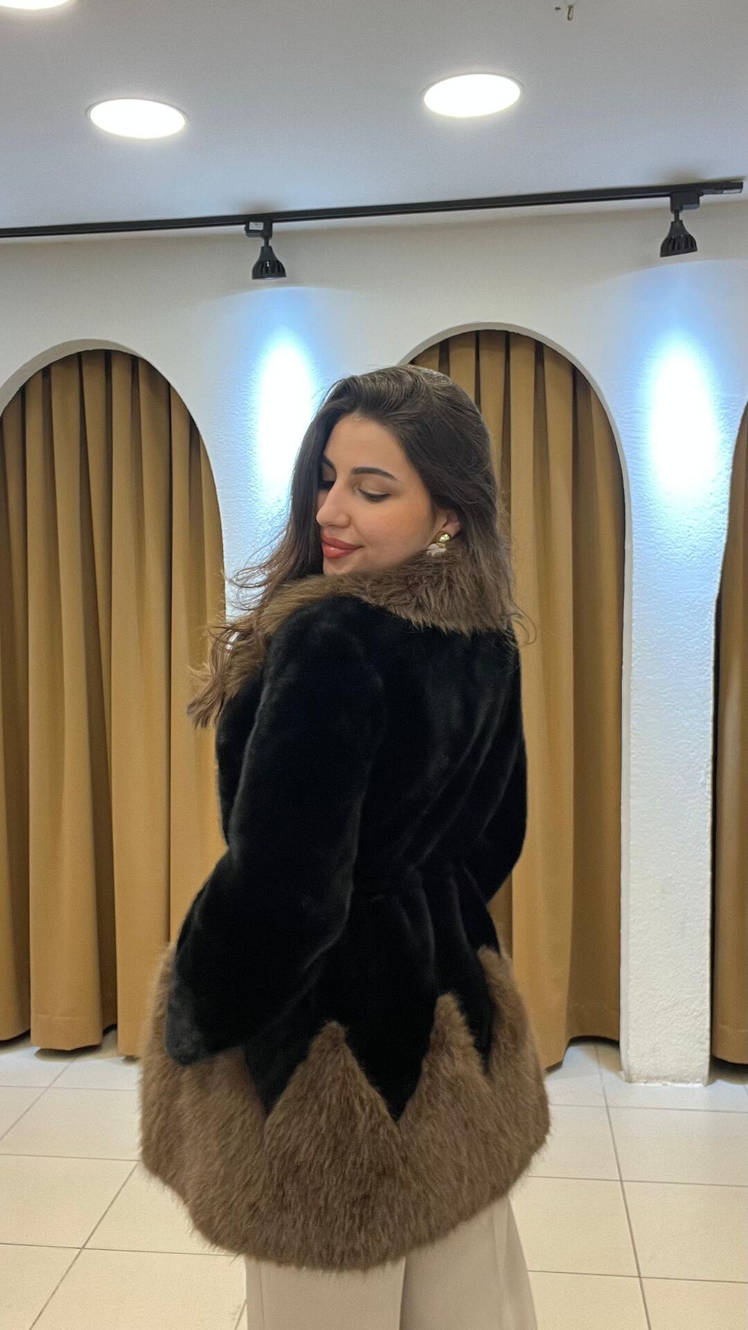 Renk: Şık siyah ve doğal kahverengi kürk kombinasyonu.