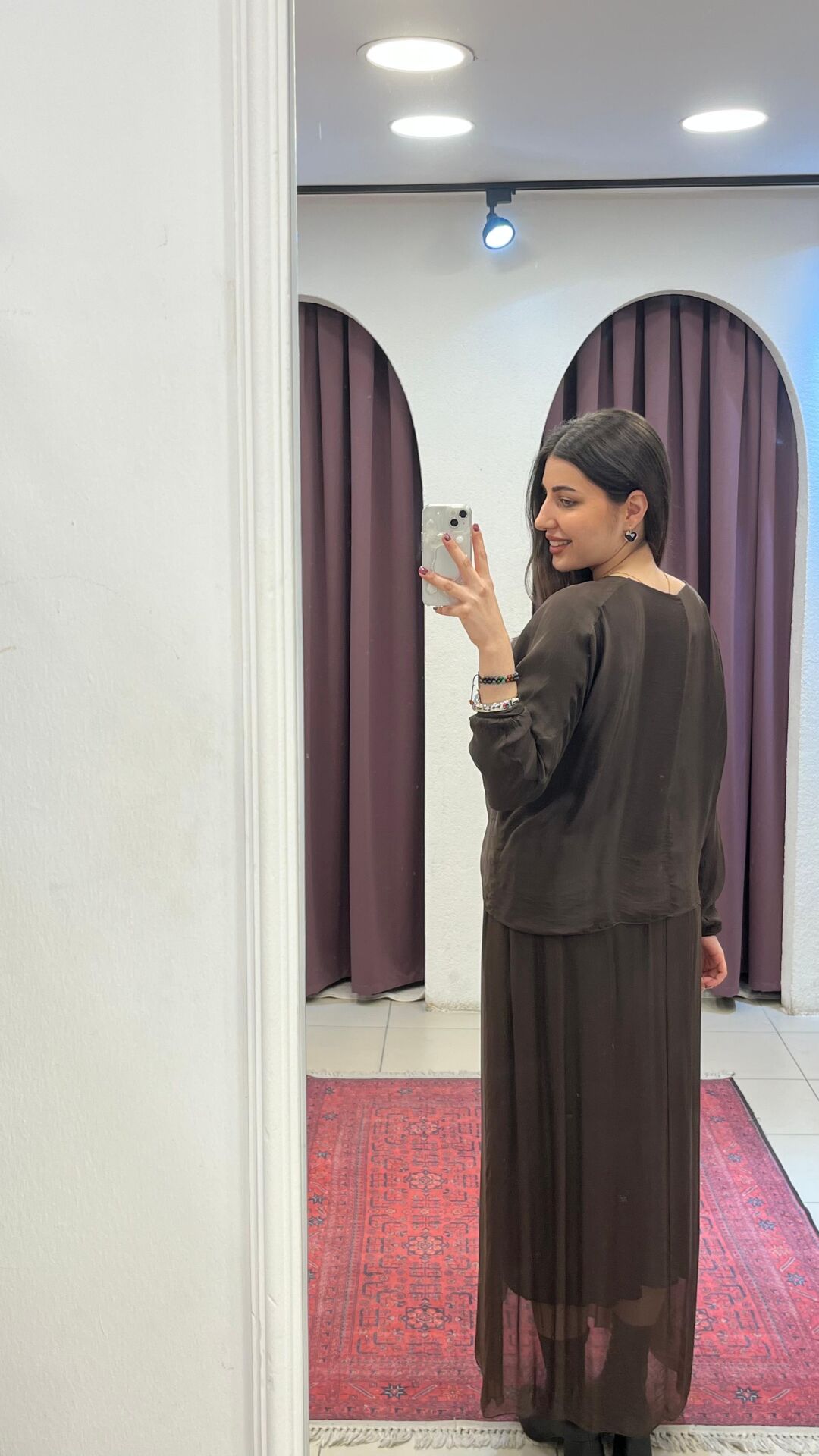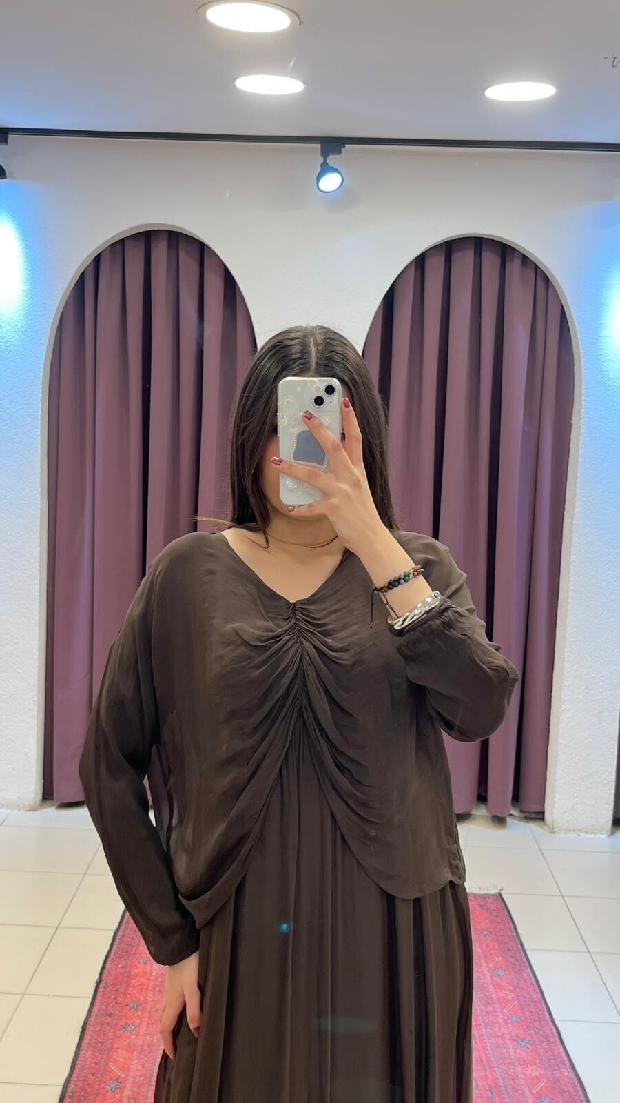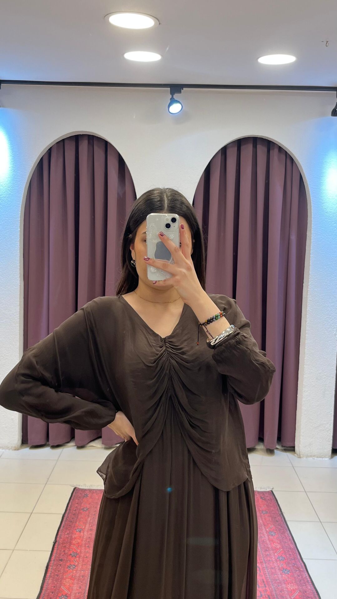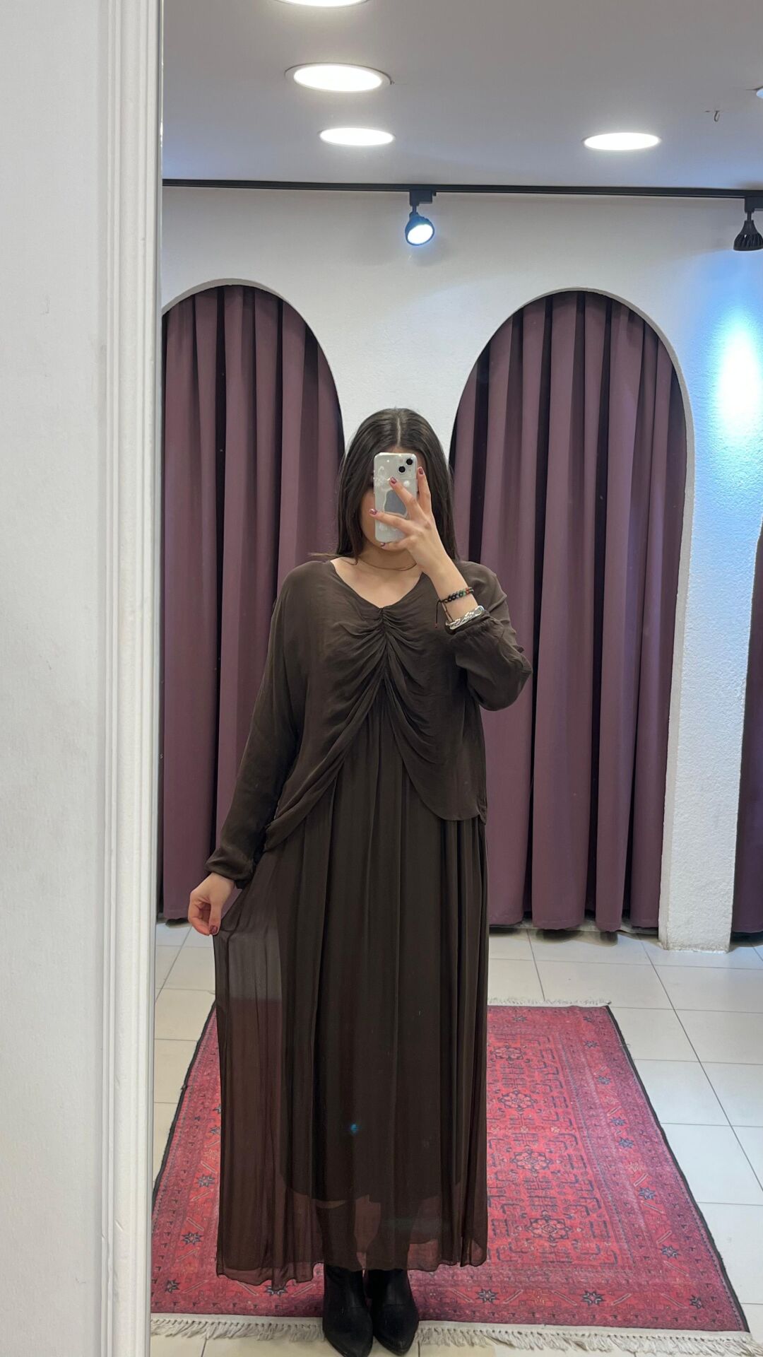 KAHVERENGİ İÇİ ASTAR DETAYLI ÜSTÜ TÜL UZUN ELBİSE Standart