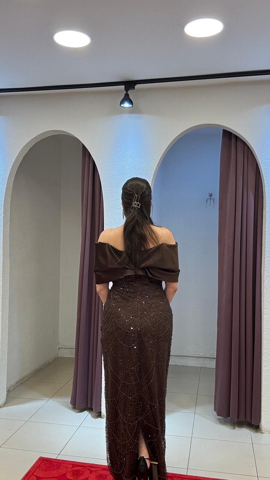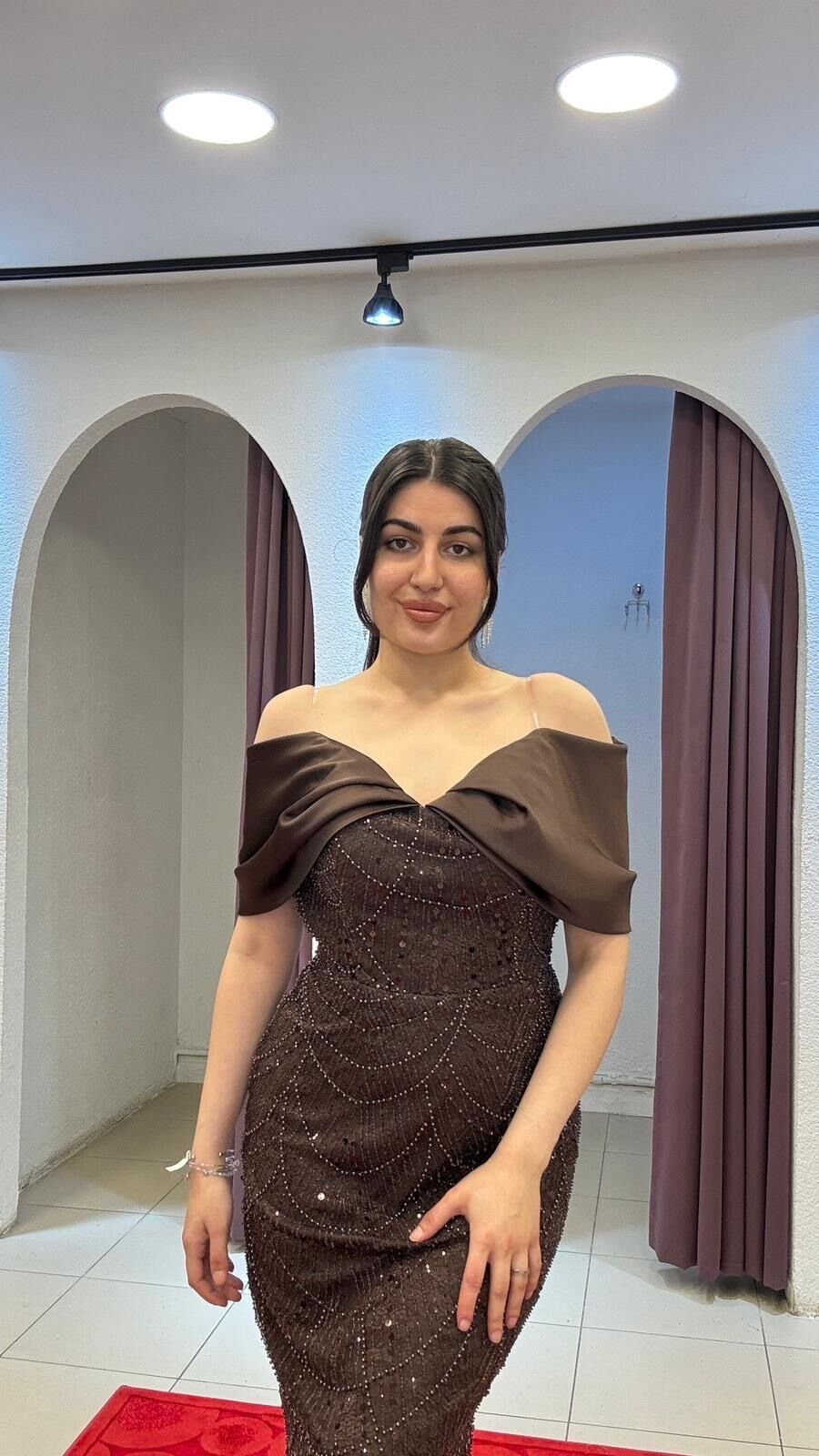 Kahverengi Madonna Yaka Taş Detaylı Balık Model Arkadan Yırtmaçlı Şık Abiye Elbise 46