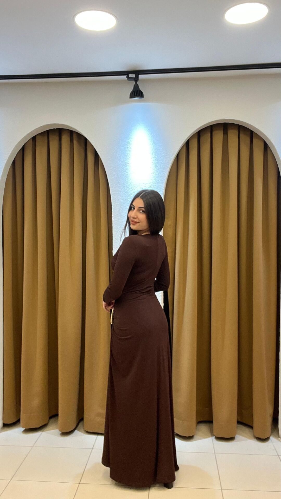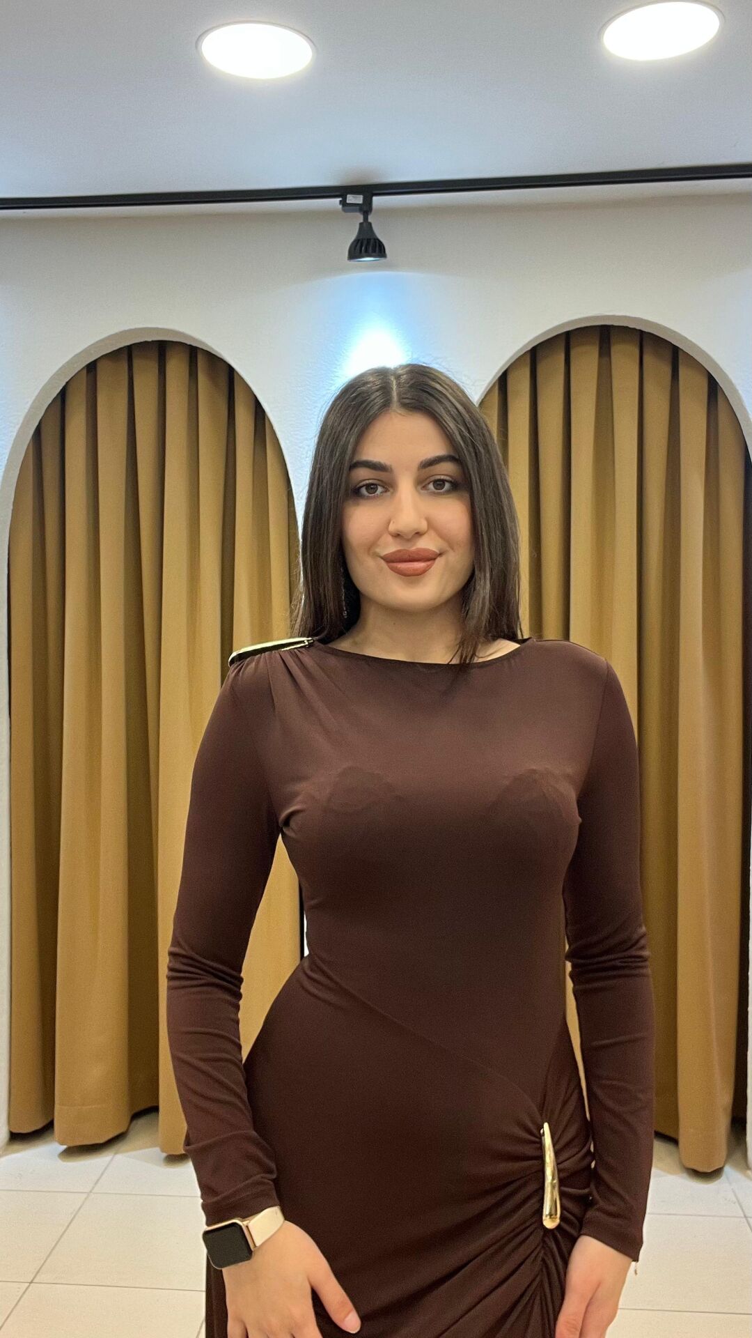 Kahverengi uzun kollu omzu gold detaylı ve bel altı drapeli uzun elbise