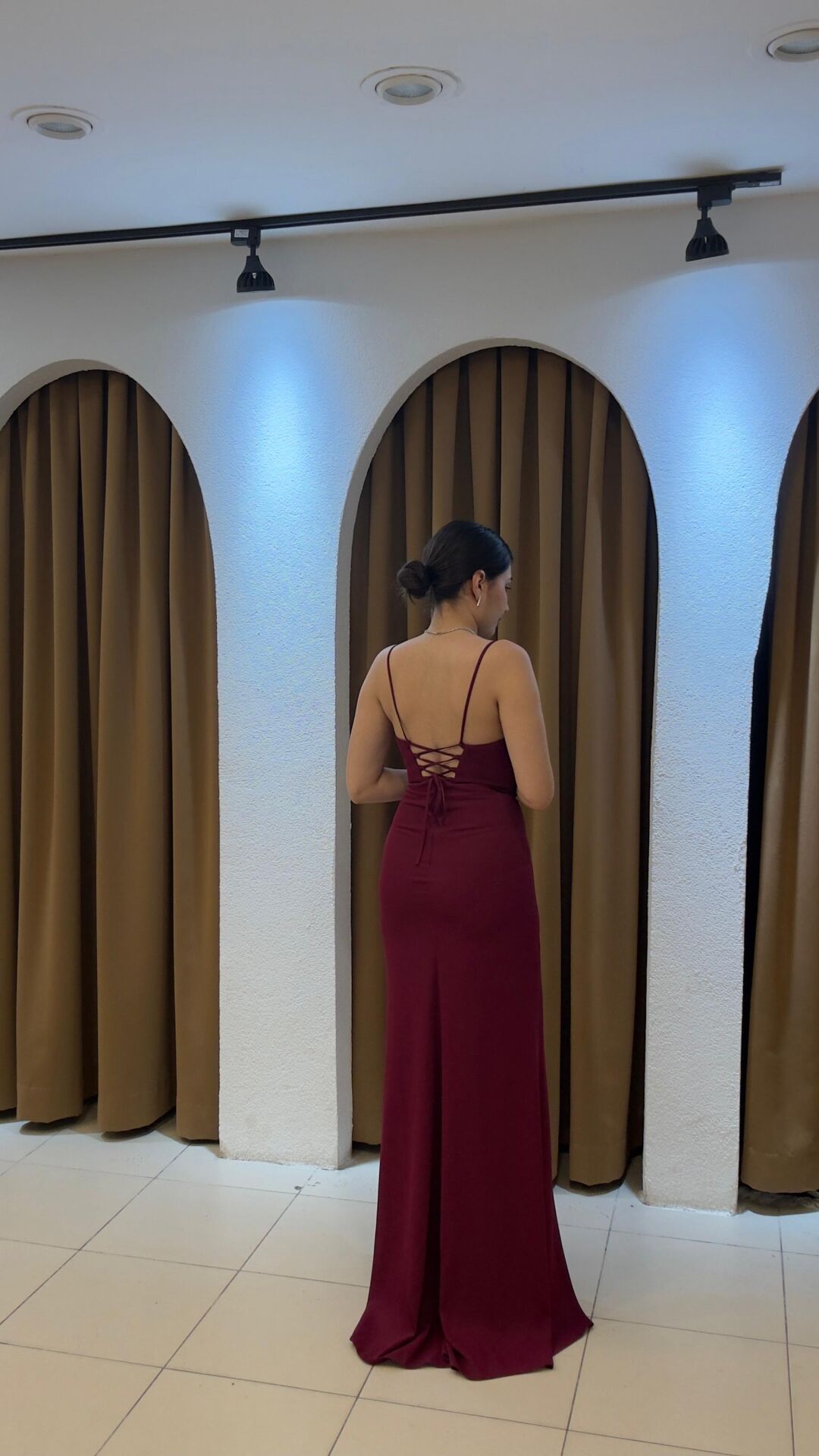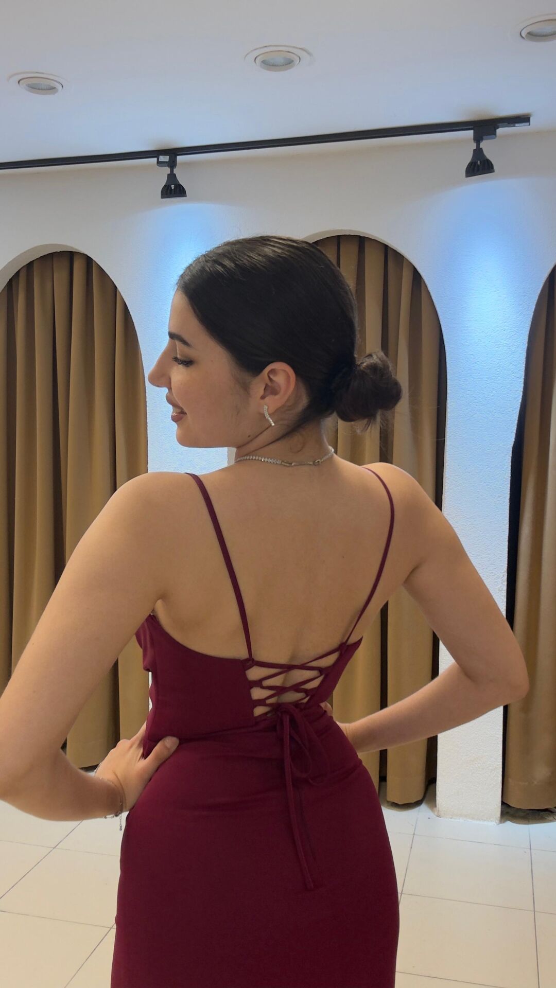 İP ASKILI ARKASI BAĞLAMALI ÖNÜ DRAPELİ YIRTMAÇLI ELBİSE