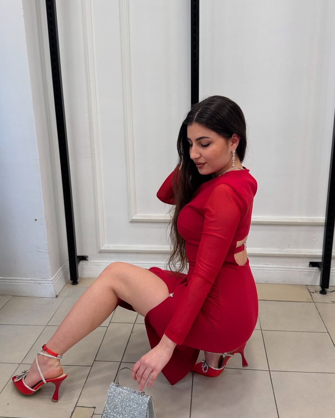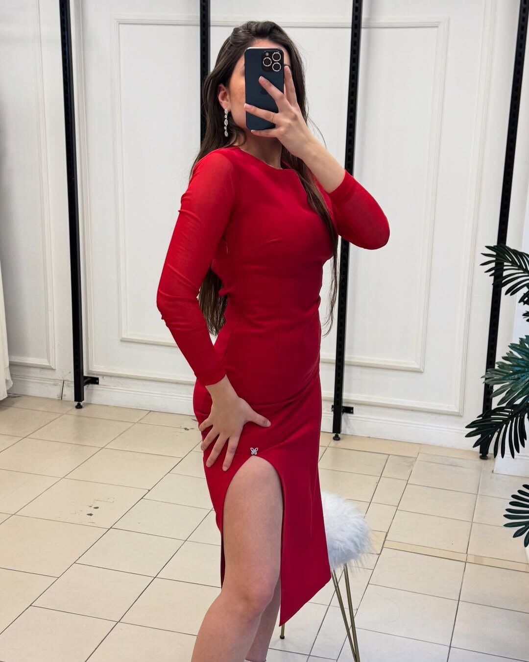 KIRMIZI KOLLARI  TÜL DETAYLI ELBİSE 36