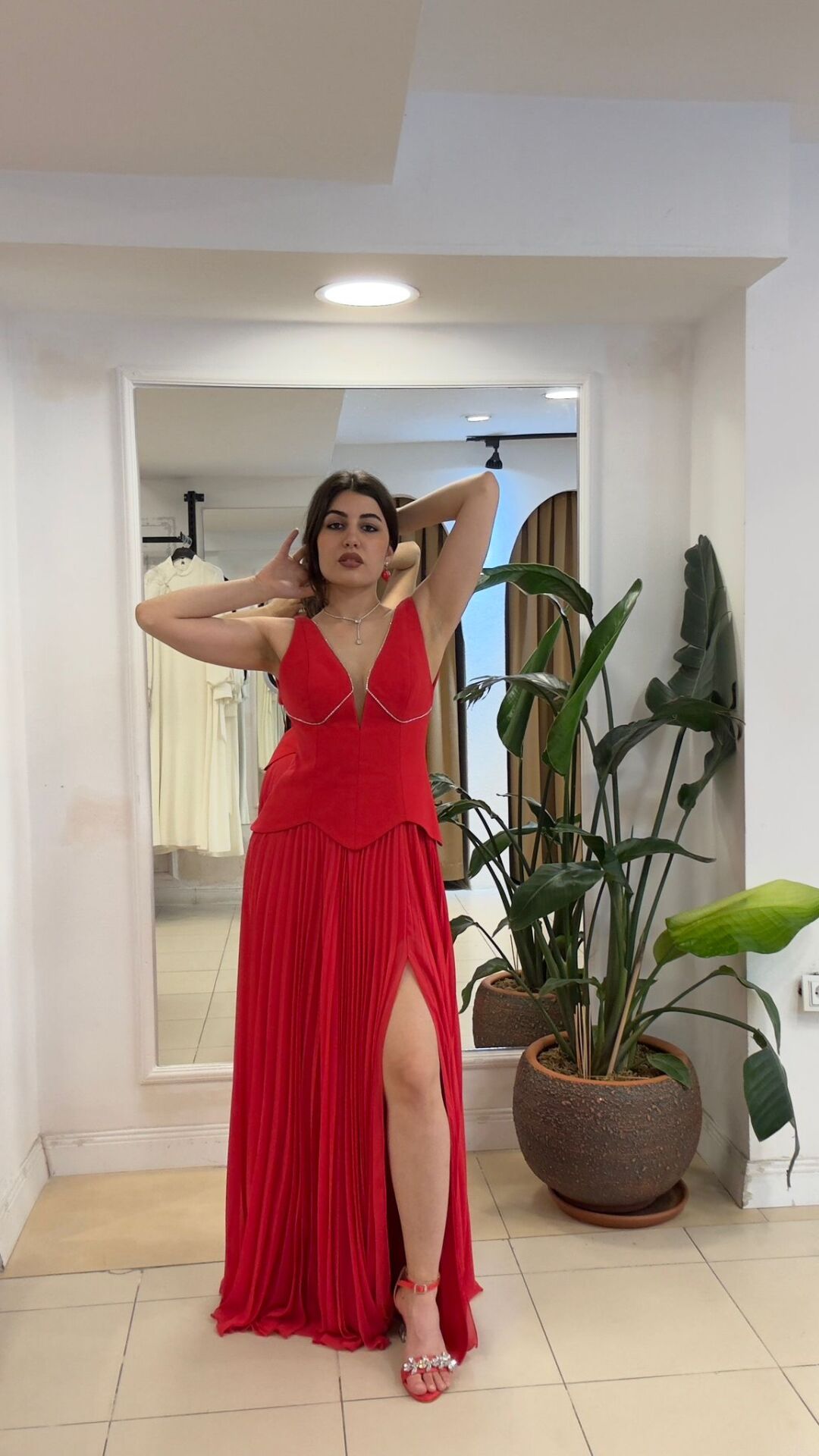 Yakası ve göğüs altı taş şeritli şifon pilisoley etekli abiye elbise