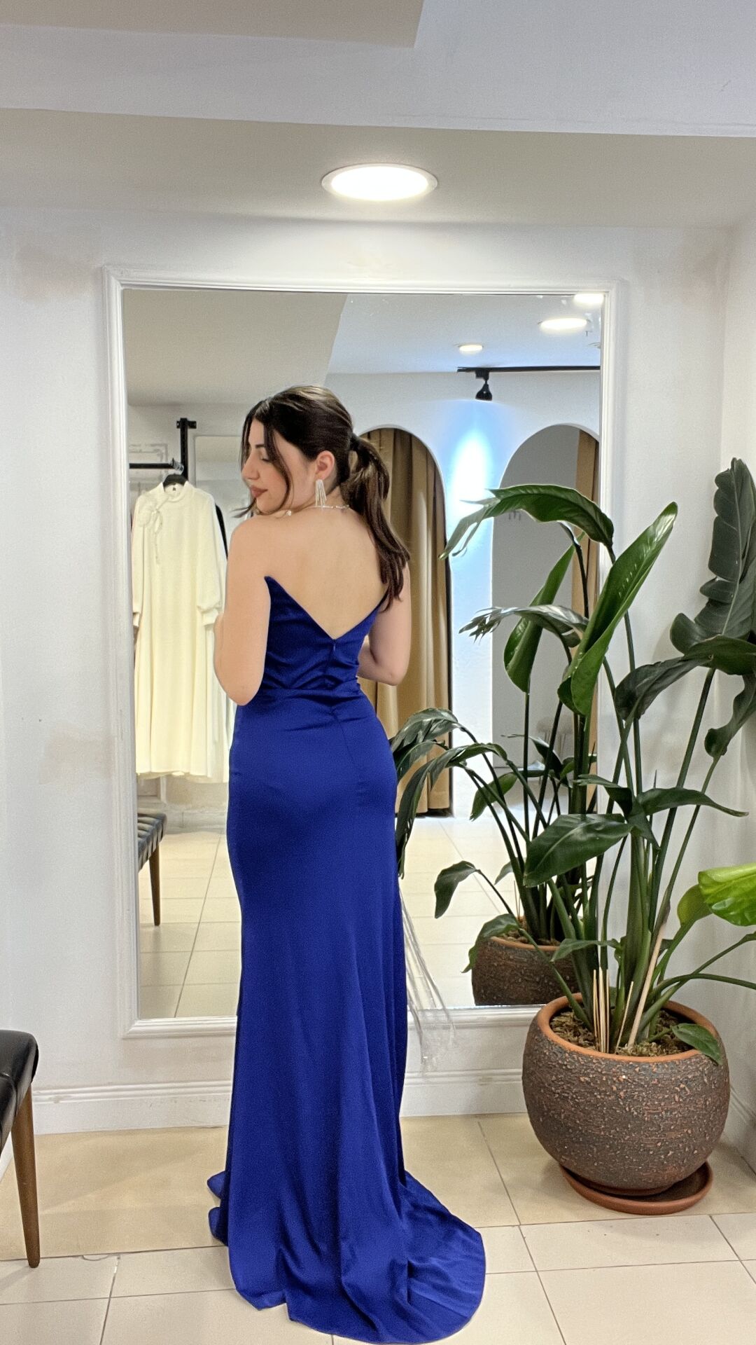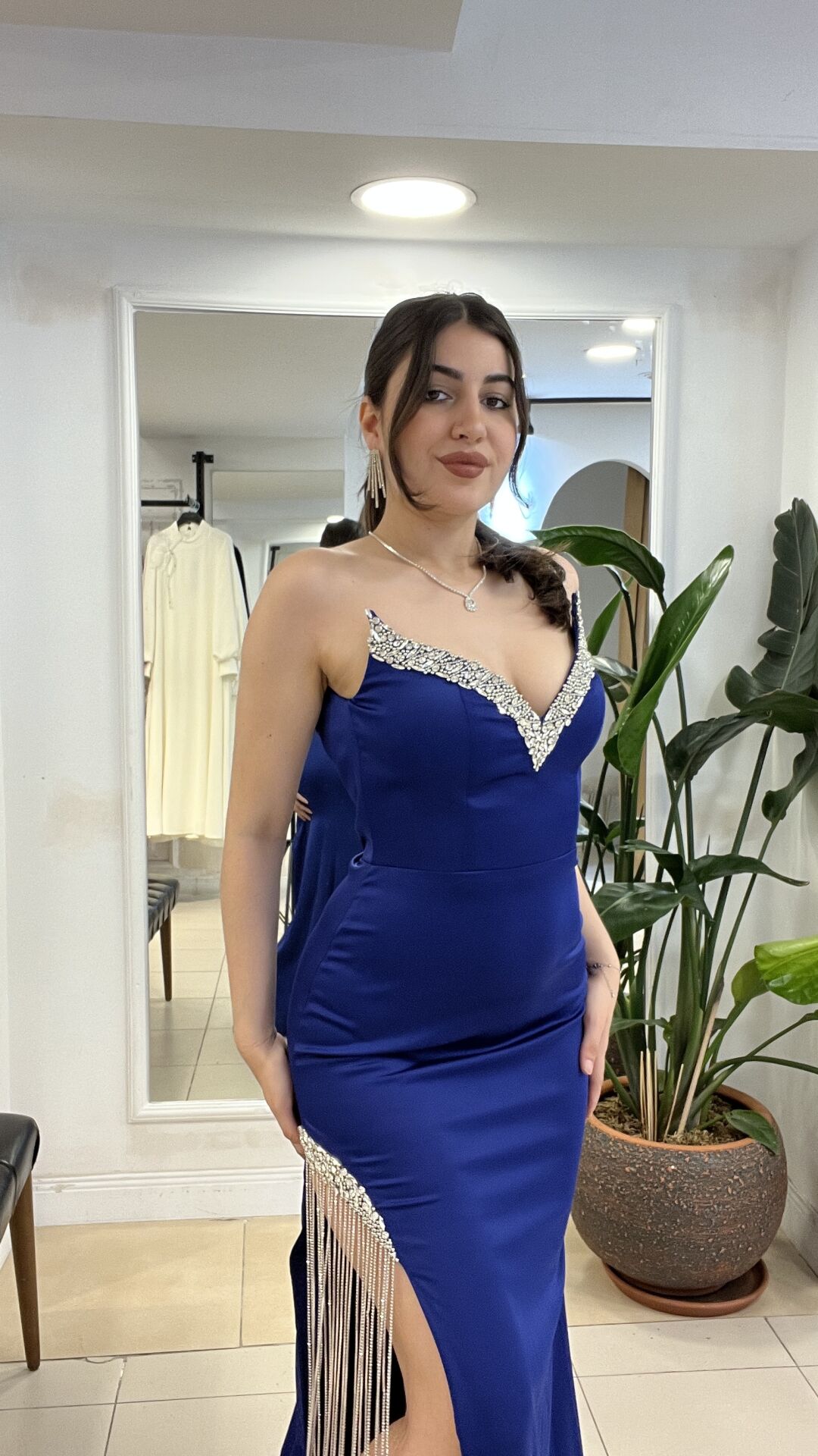 Bacağında taş şeritli kedi yaka lacivert abiye