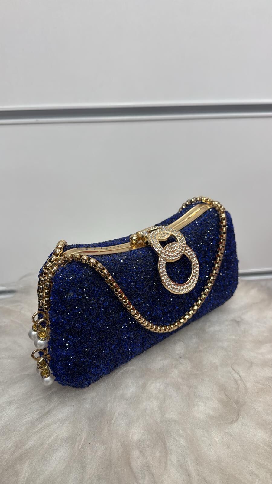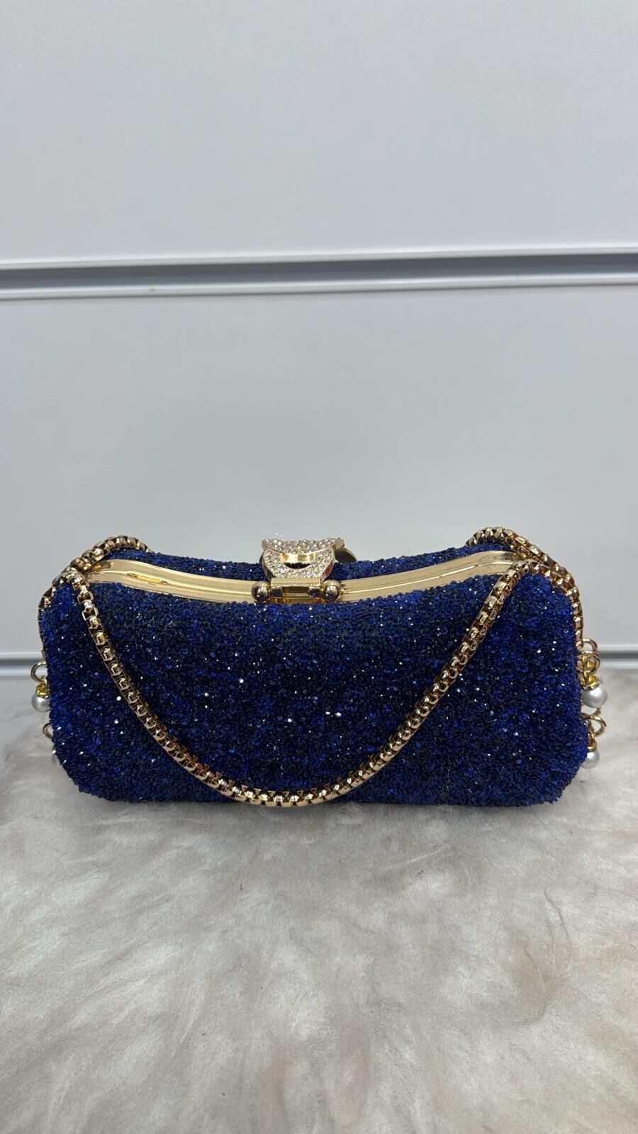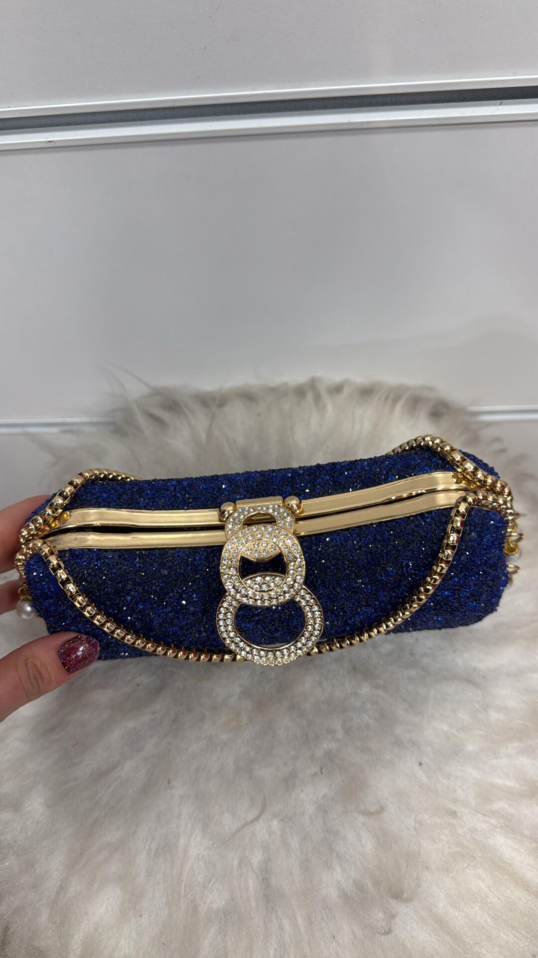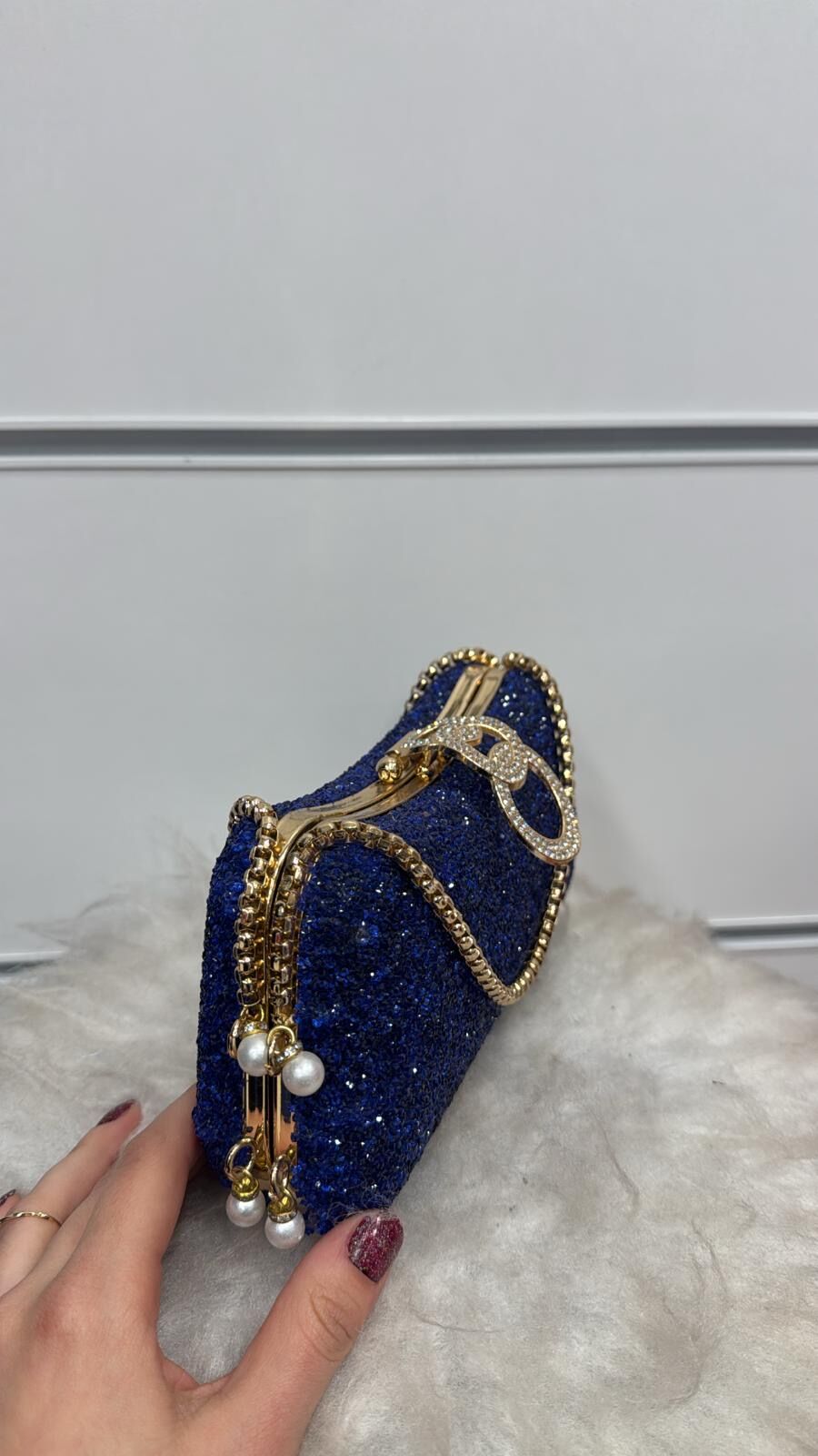 Lacivert kendinden yaşlı yanları inci detaylı gold şık kapağı abiye çanta