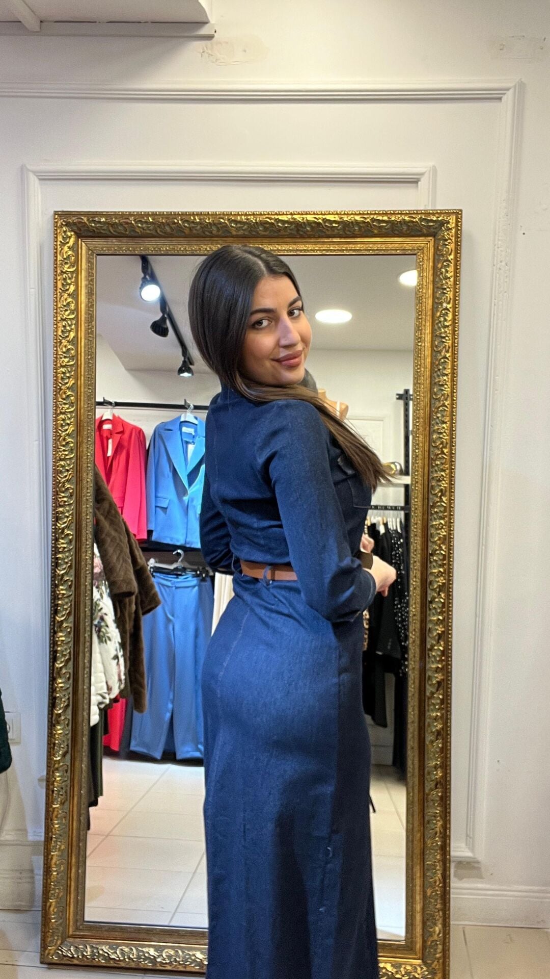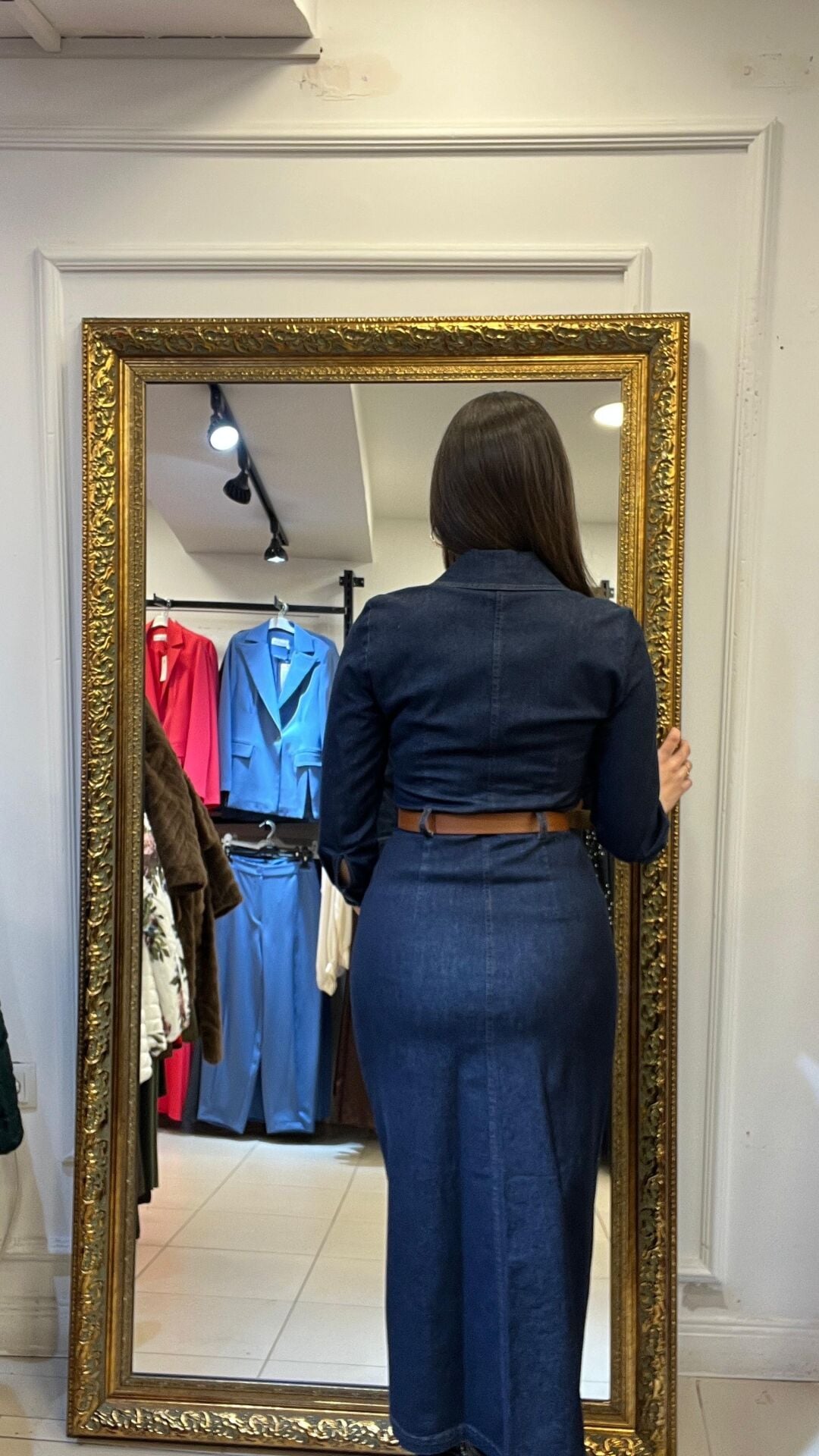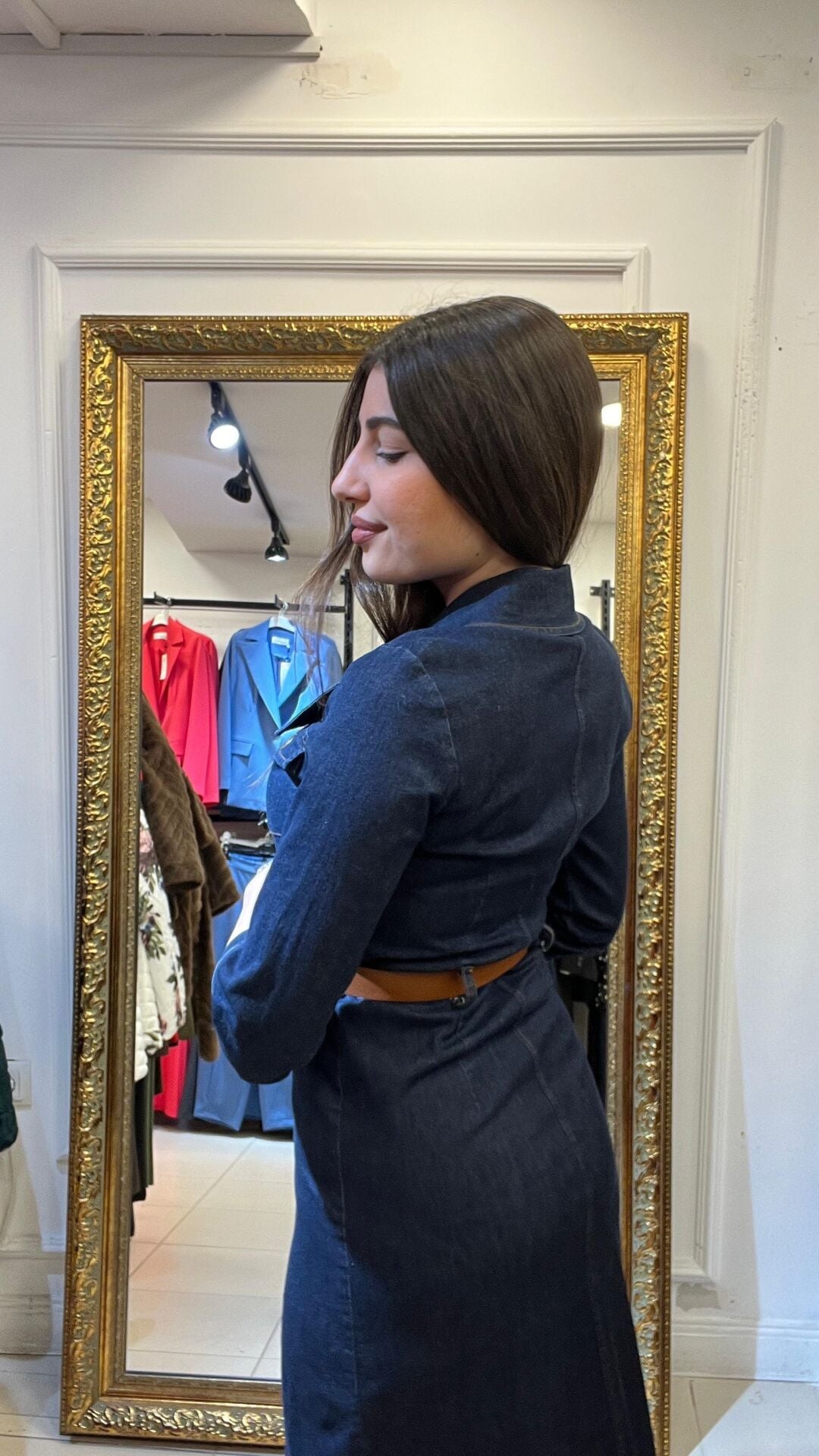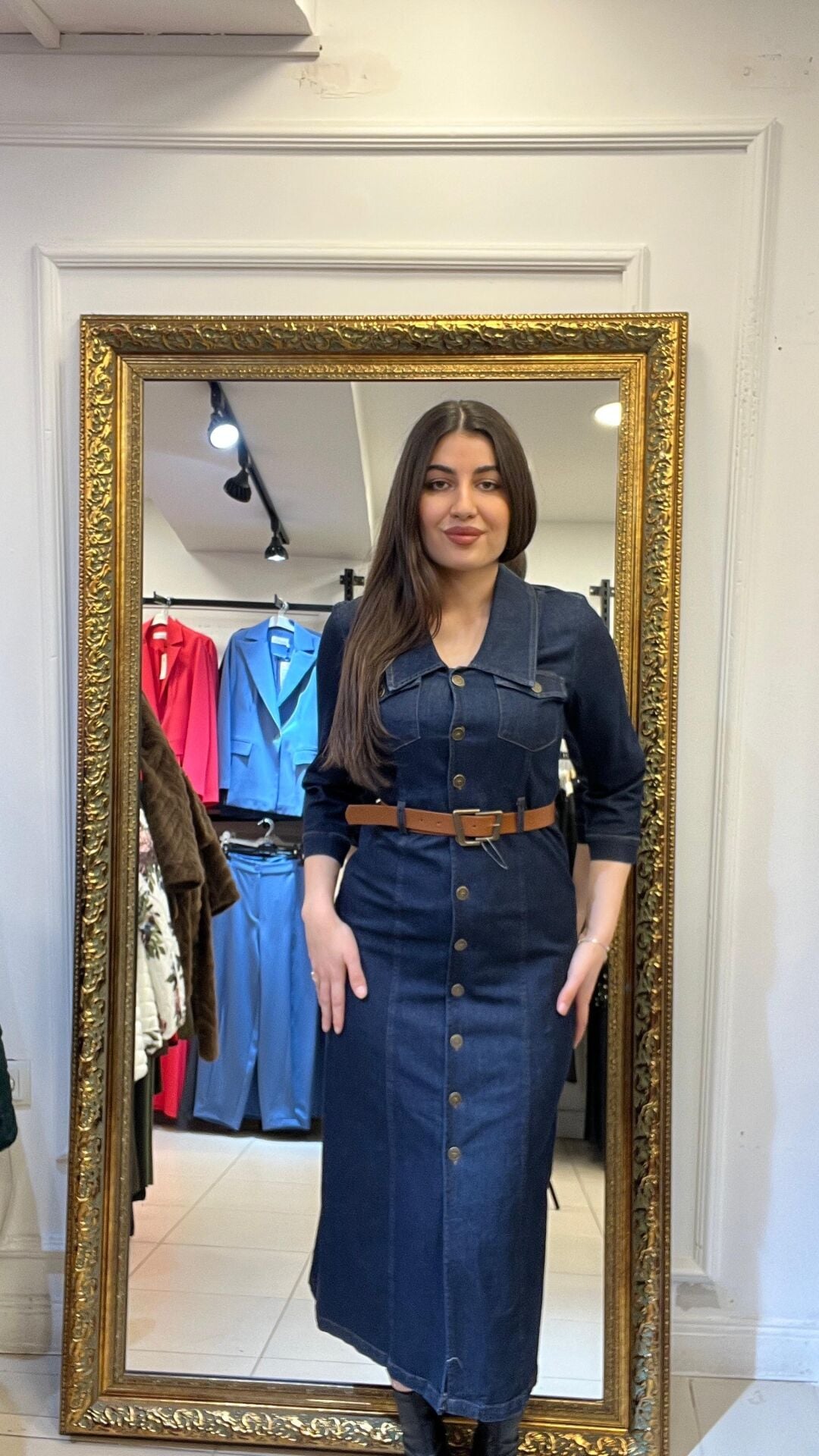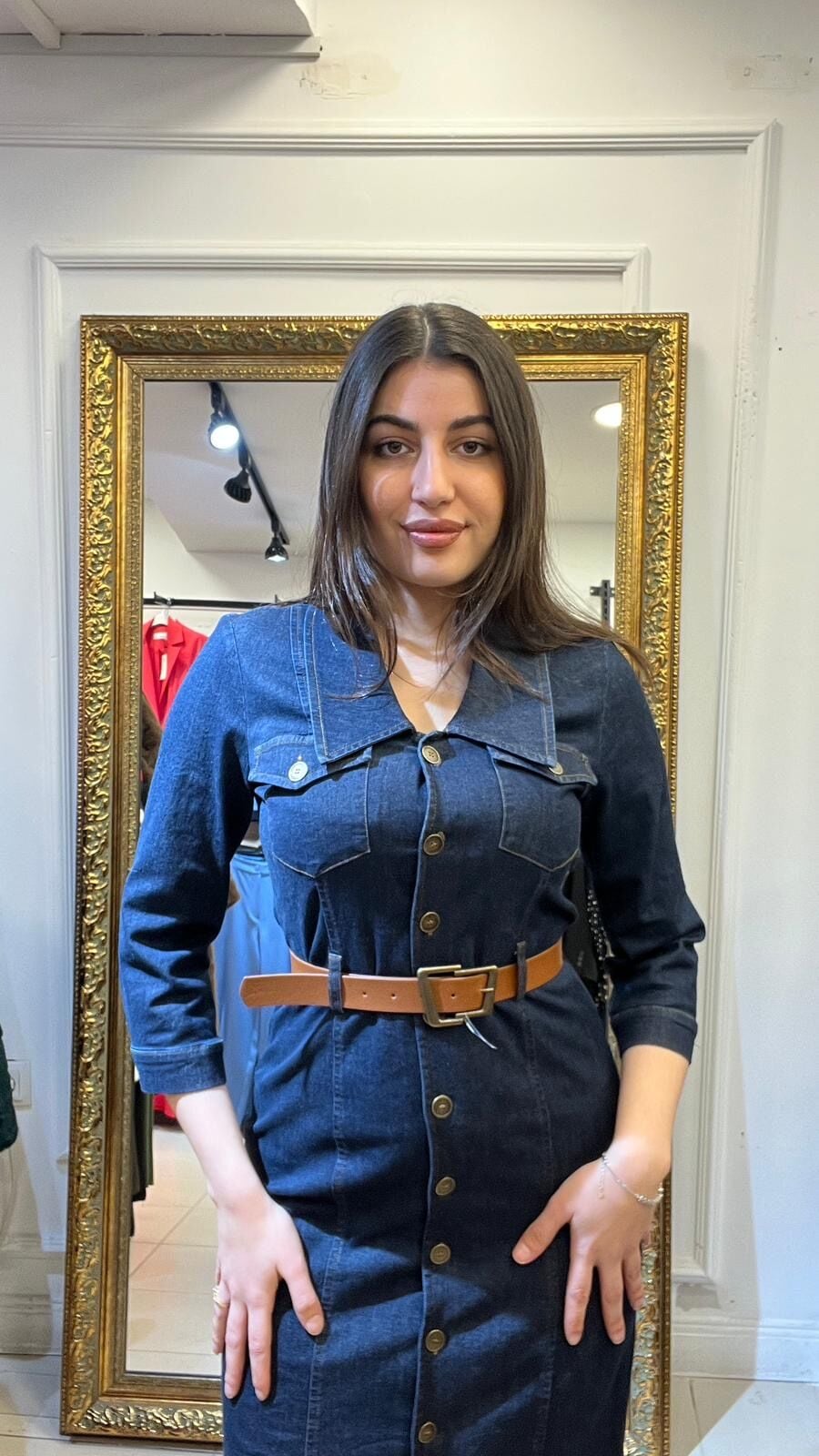 Önden düğmeli kemerli önden yırtmaçlı kot elbise