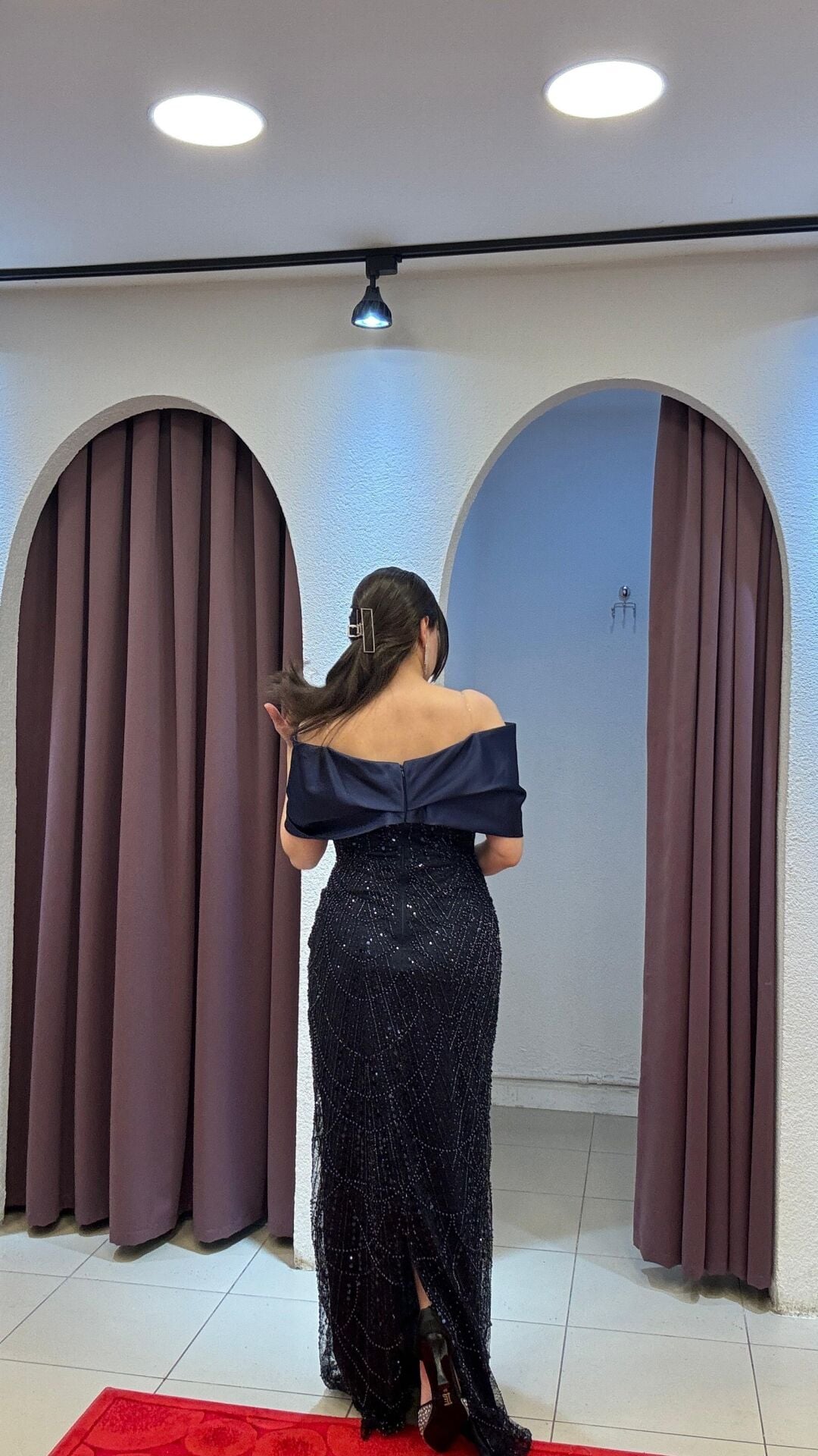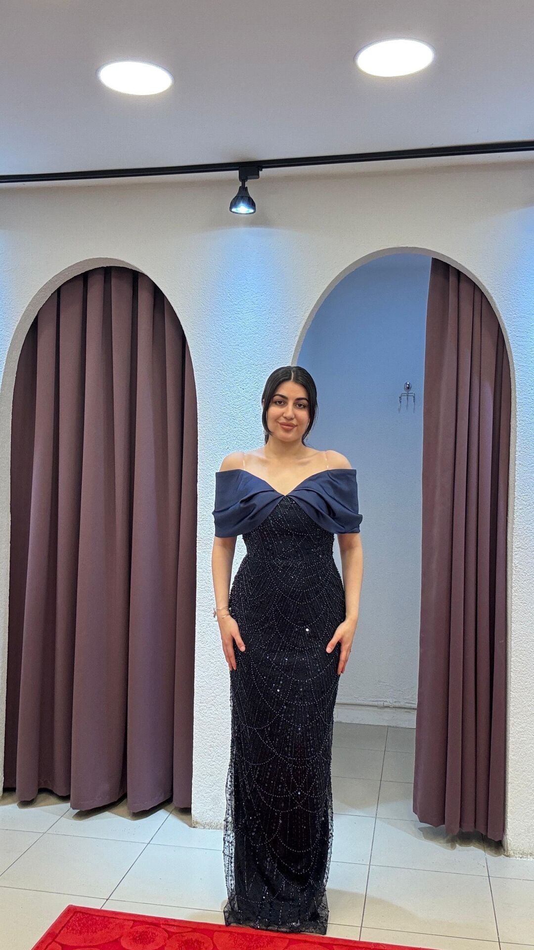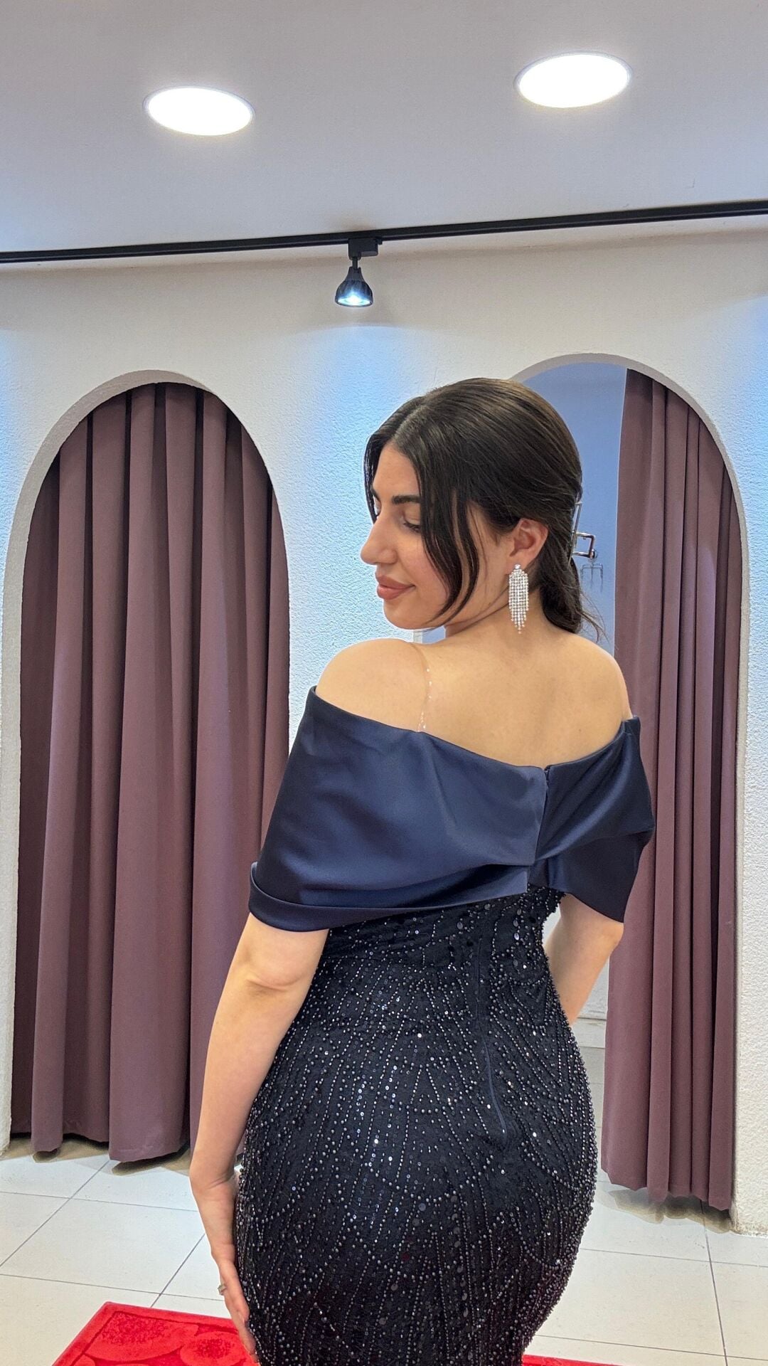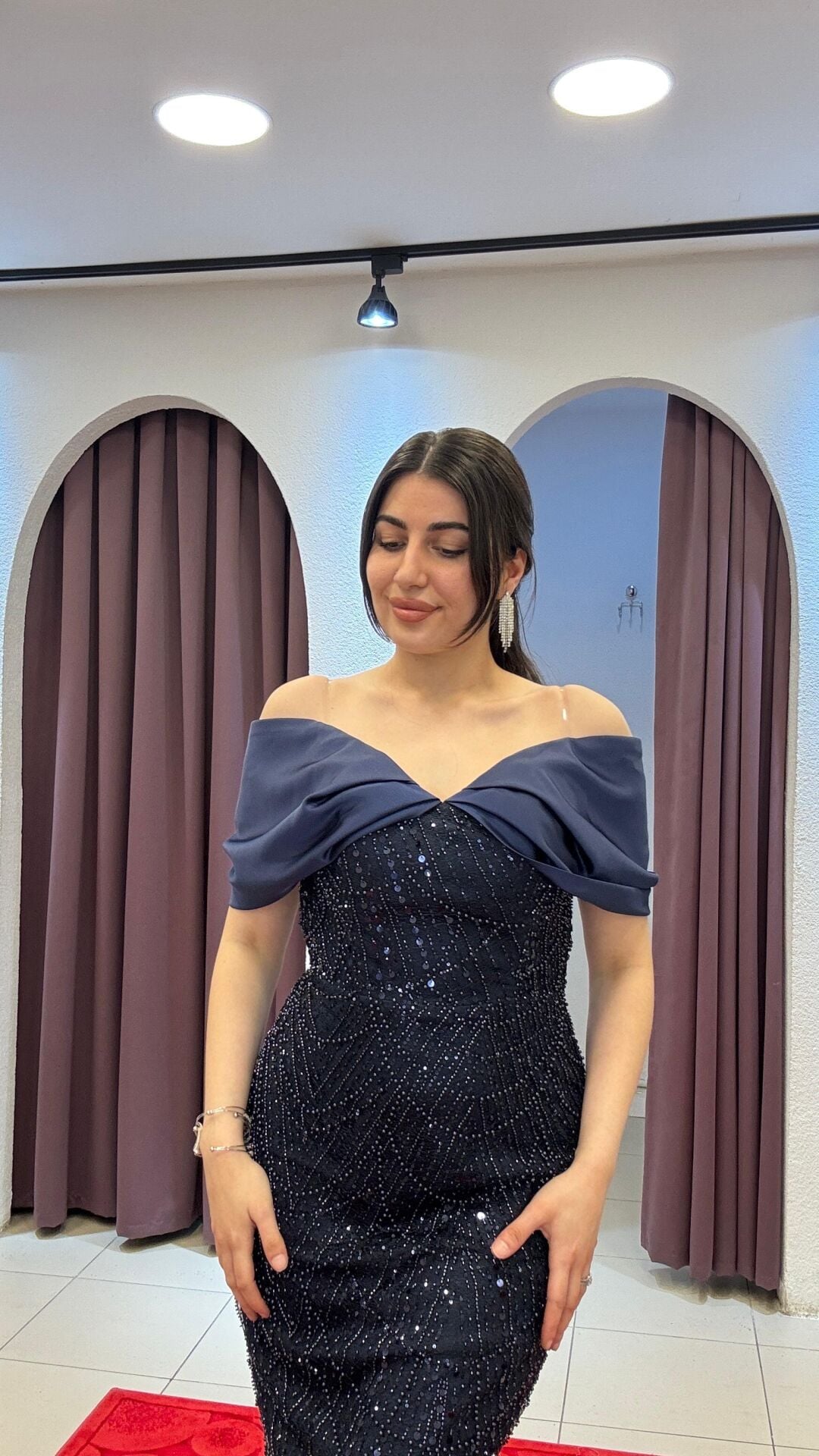 Lacivert Madonna Yaka Taş Detaylı balık Model Arkadan Yırtmaçlı Şık Abiye Elbise 46
