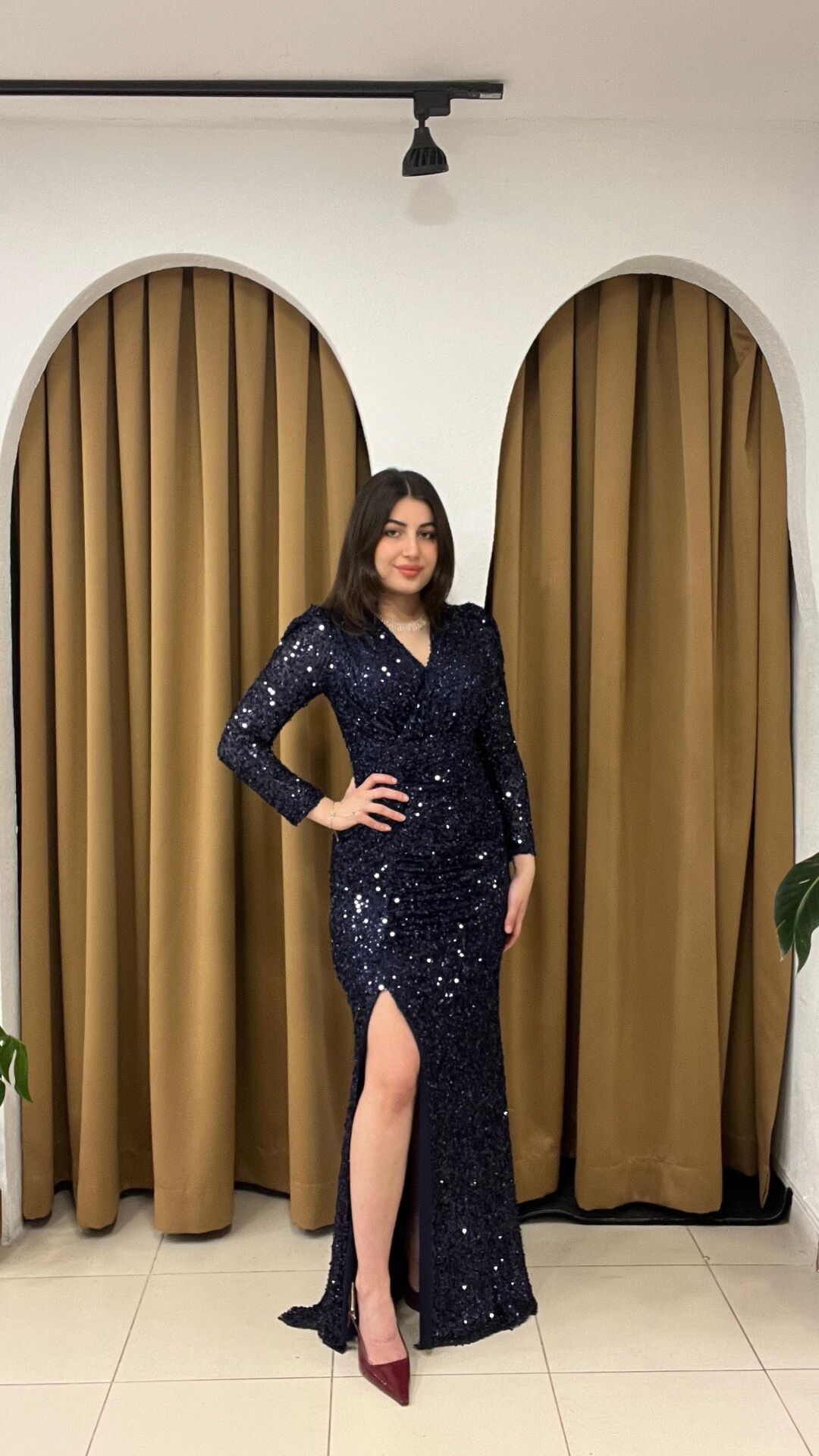 - Siluet / Kesim: Mermaid (denizkızı) modeli – vücudu sıkı saran, kalçadan aşağı doğru dalgalı açılan klasik gece elbisesi kesimi