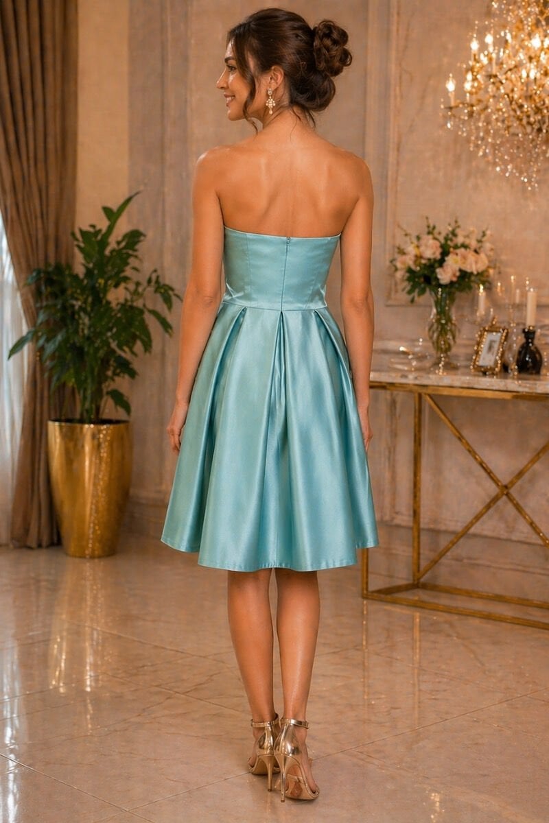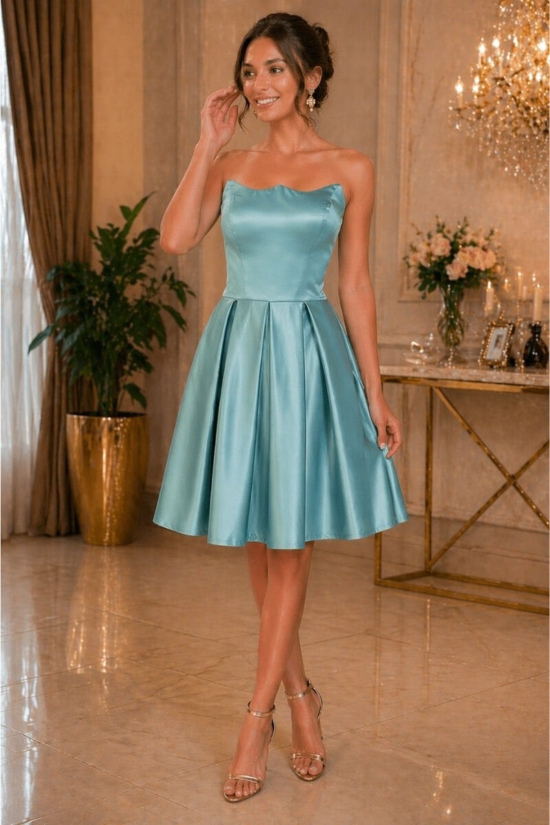Mint Yeşili Straplez Saten Mini Elbise Mezuniyet Nişan Davet Elbisesi 42