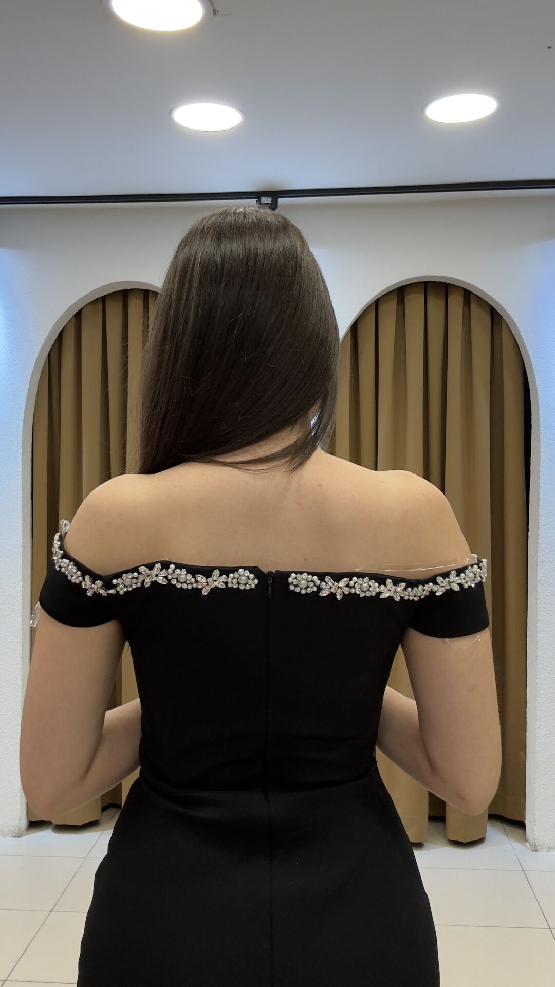 Konum: İşleme, omuz başlarından başlayarak hem göğüs önündeki V-yaka dekoltesi çevresini hem de sırtın üst kısmındaki (omuzlar arası) hattı tamamen sarmaktadır. Bu sayede elbise, hem önden hem de arkadan bakıldığında bütüncül bir ışıltı sunar.