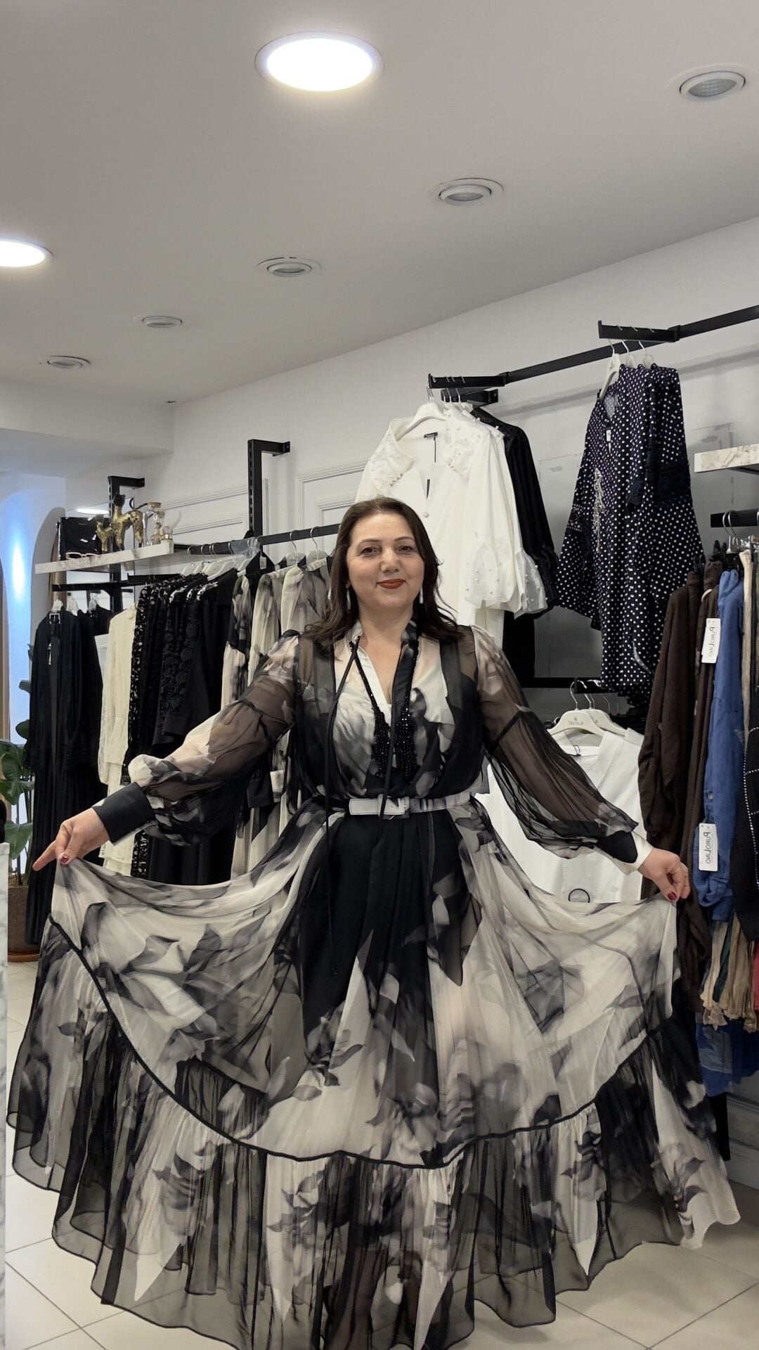 Uzun, transparan kolları ve derin V yaka detayı ile feminen bir şıklık sunar. Bel kısmı beyaz bir kemerle vurgulanan elbise, katmanlı ve geniş etek tasarımıyla hareketli bir görünüm sağlar. Özel davetler, kokteyller veya şık akşam yemekleri için ideal bir seçimdir. Rahat ve akıcı yapısıyla hem şık hem de konforlu bir deneyim