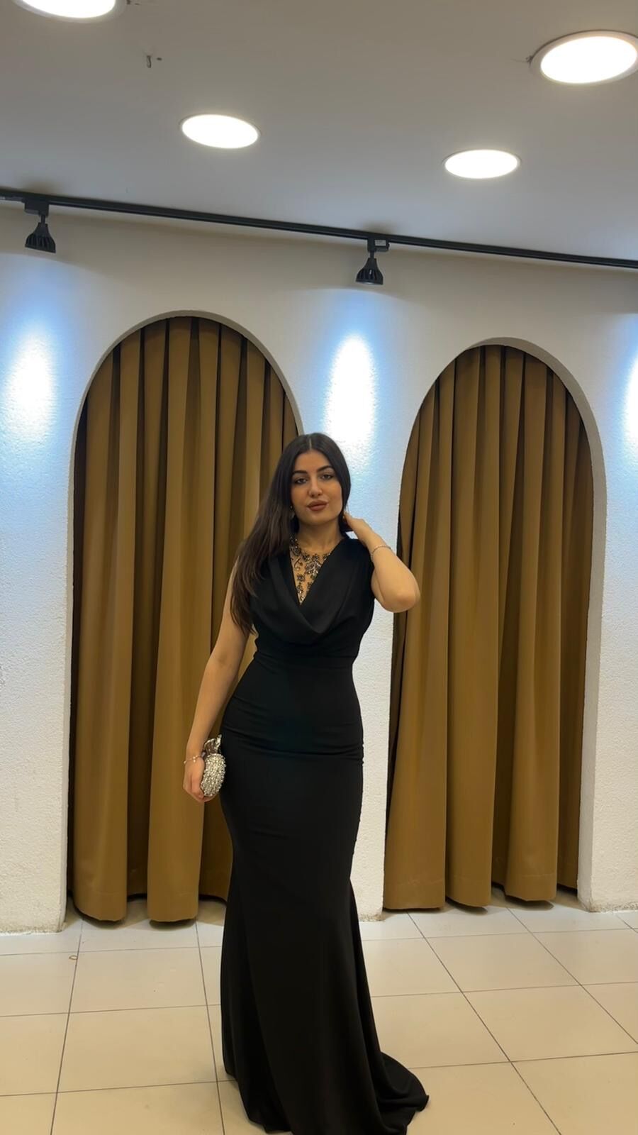 Göğsü tüllü taş işlemeli degaje yaka balık model saten abiye elbise
