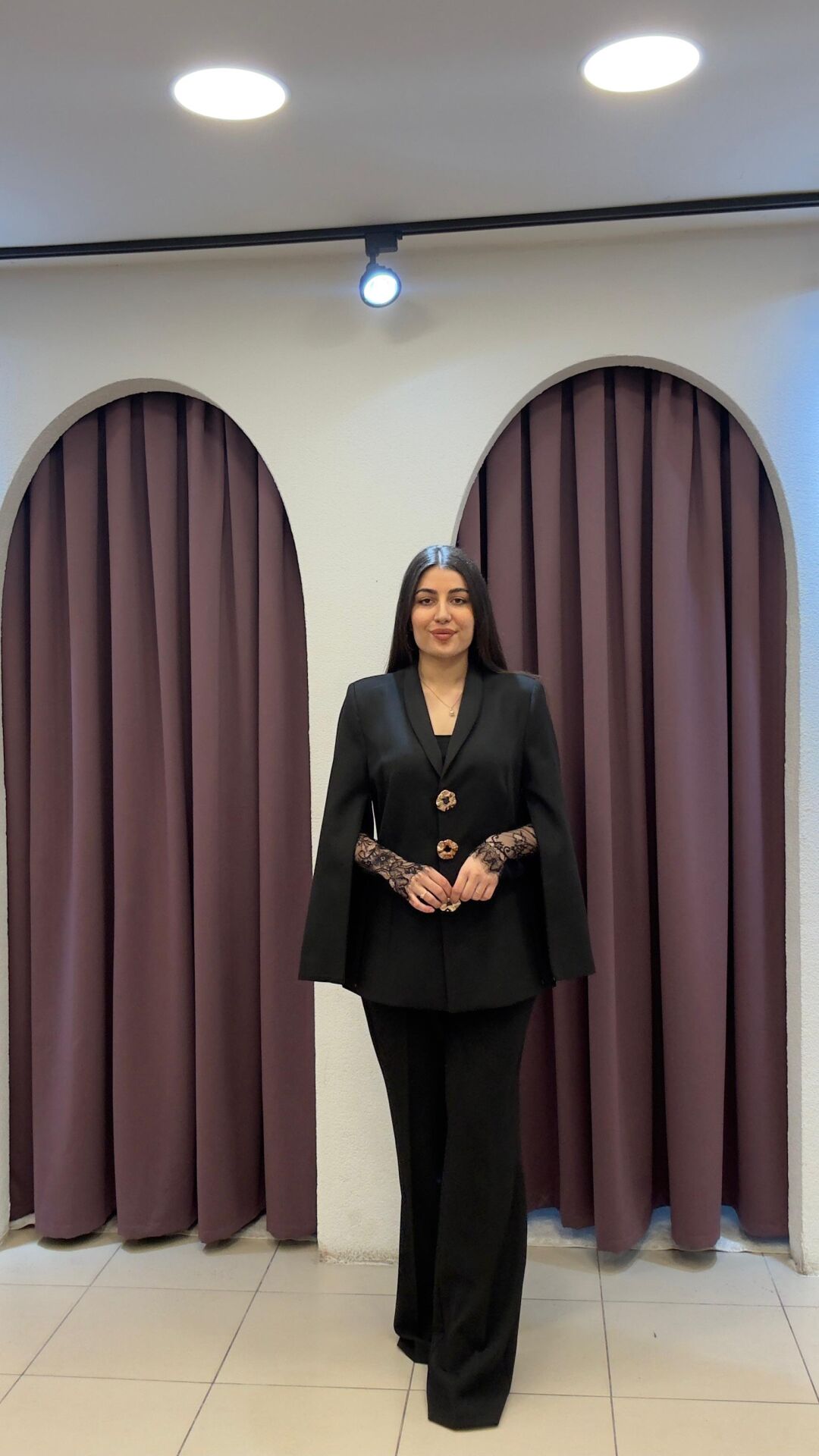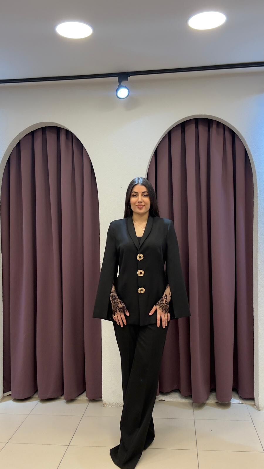 SİYAH GOLD DÜĞMELİ KOLLARI DANTEL DETAYLI VE FERMUAR PANTOLONU BELİ LASTİKLİ TAKIM SİYAH - 48