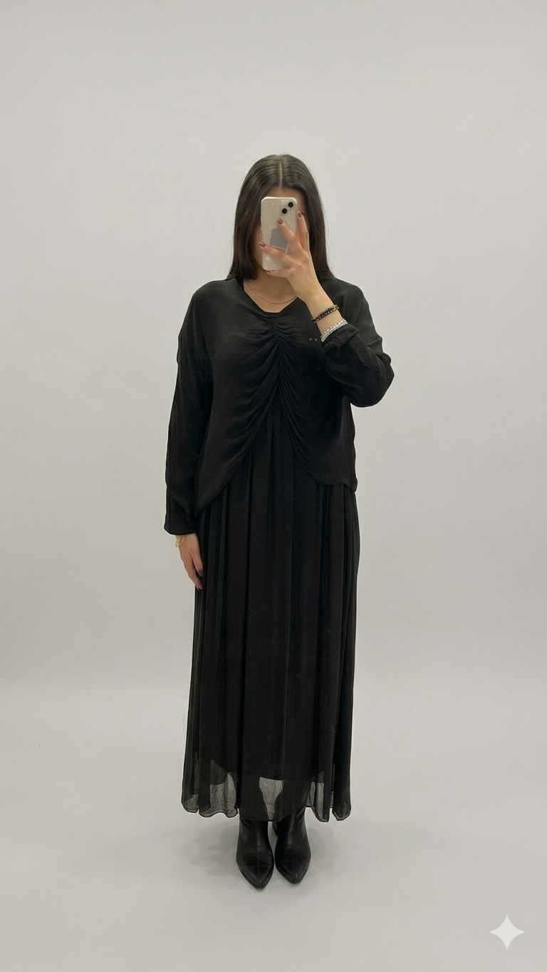 Bu özel tasarım, üstü tamamen tül kaplı, hafif ve havadar bir görünüm sunarken, iç kısmı astarlı detaylarıyla hem rahat hem de vücudu tam örten bir yapıya sahip. Tesettürlü hanımların da gönül rahatlığıyla tercih edebileceği bu elbise, şıklık ve mütevaziliği bir arada barındırıyor. Öne çıkan özellikler: Üst kısım şeffaf görünümlü kaliteli tül kumaş İç astar sayesinde tamamen kapalı ve rahat kullanım Kemer takmadan da kullanılabilir (mankenimizde kemerle kombine edilerek gösterilmiştir – isteğe bağlı kemer detayı ile beli daha da vurgulayabilirsiniz) Standart kesim – 36’dan 52 bedene kadar geniş beden skalası Petrol mavisi rengiyle hem davetlerde hem özel gecelerde göz alıcı bir seçenek Uzun boyuyla tam boy abiye etkisi yaratır Kullanım alanları: Nişan, düğün, sünnet, mezuniyet, özel davetler veya akşam yemekleri için ideal. Hem modern hem klasik bir hava katıyor. Kumaş yumuşak dokusu sayesinde gün boyu rahat taşıyabileceğiniz, hareket özgürlüğü sunan bu elbise ile her adımda zarafetinizi konuşturun! Not: Ürün görsellerinde manken kemerli hali gösterilmiştir, ancak kemersiz de çok şık durmaktadır.