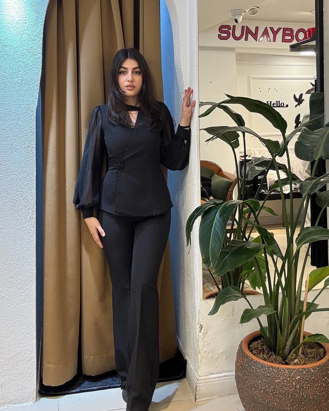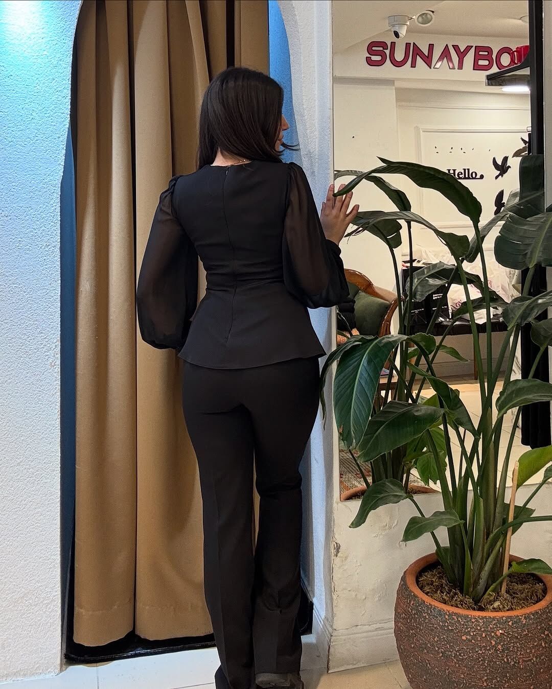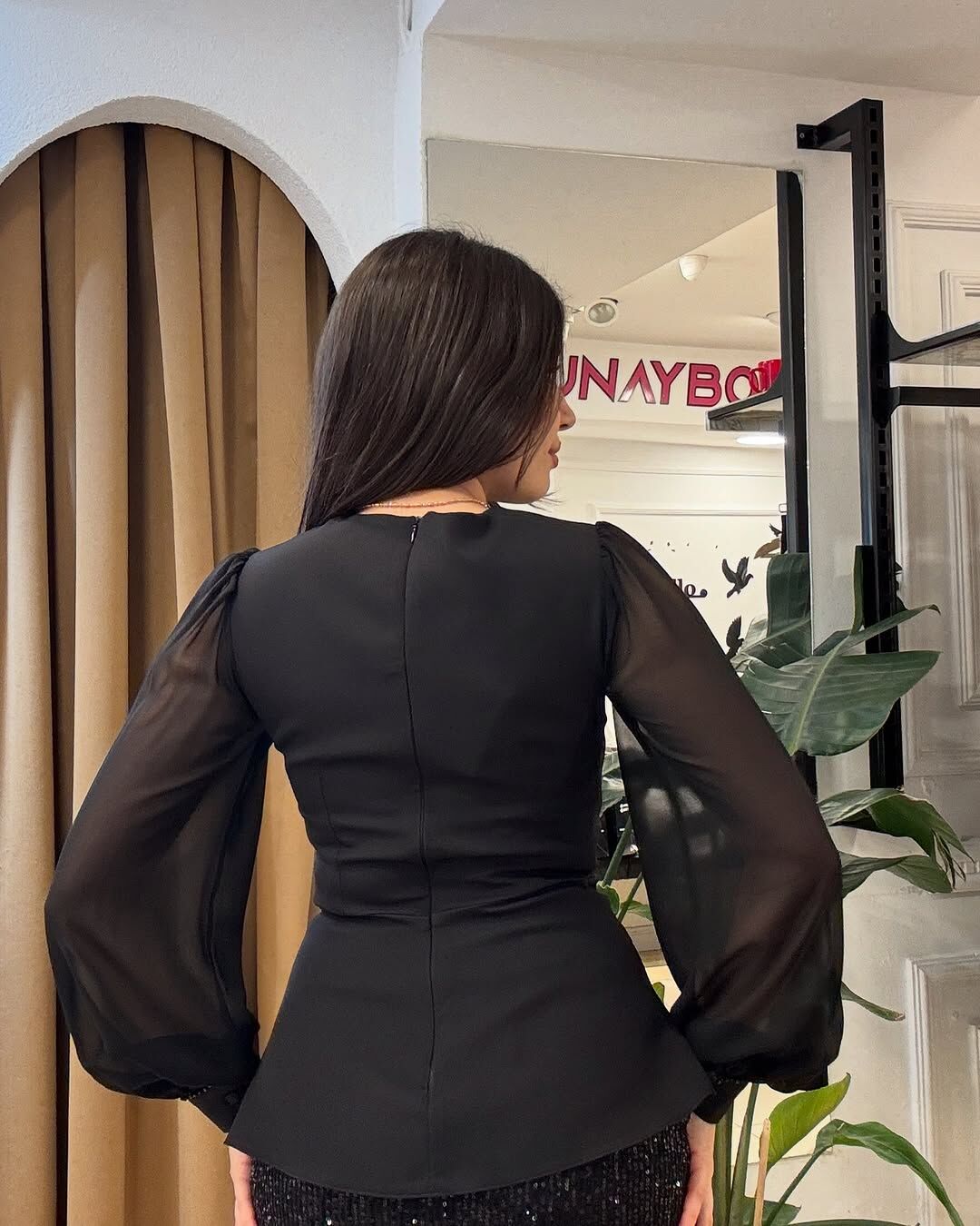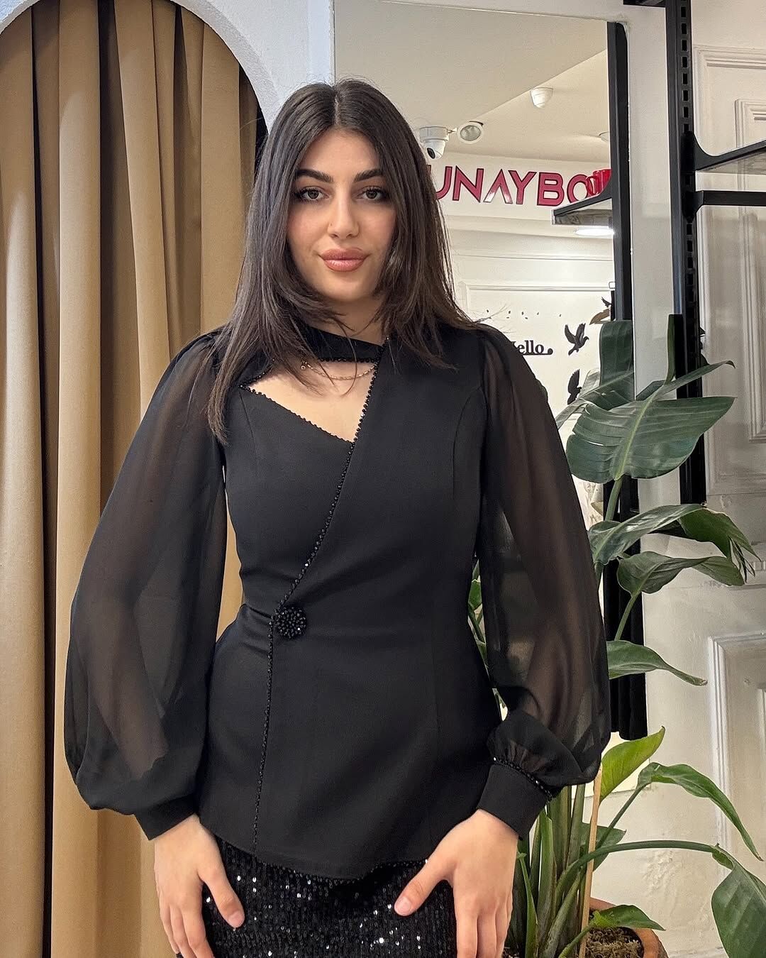 Şeffaf kollar ve asimetrik kesim, bluzun zarif ve modern tarzını öne çıkarıyor.