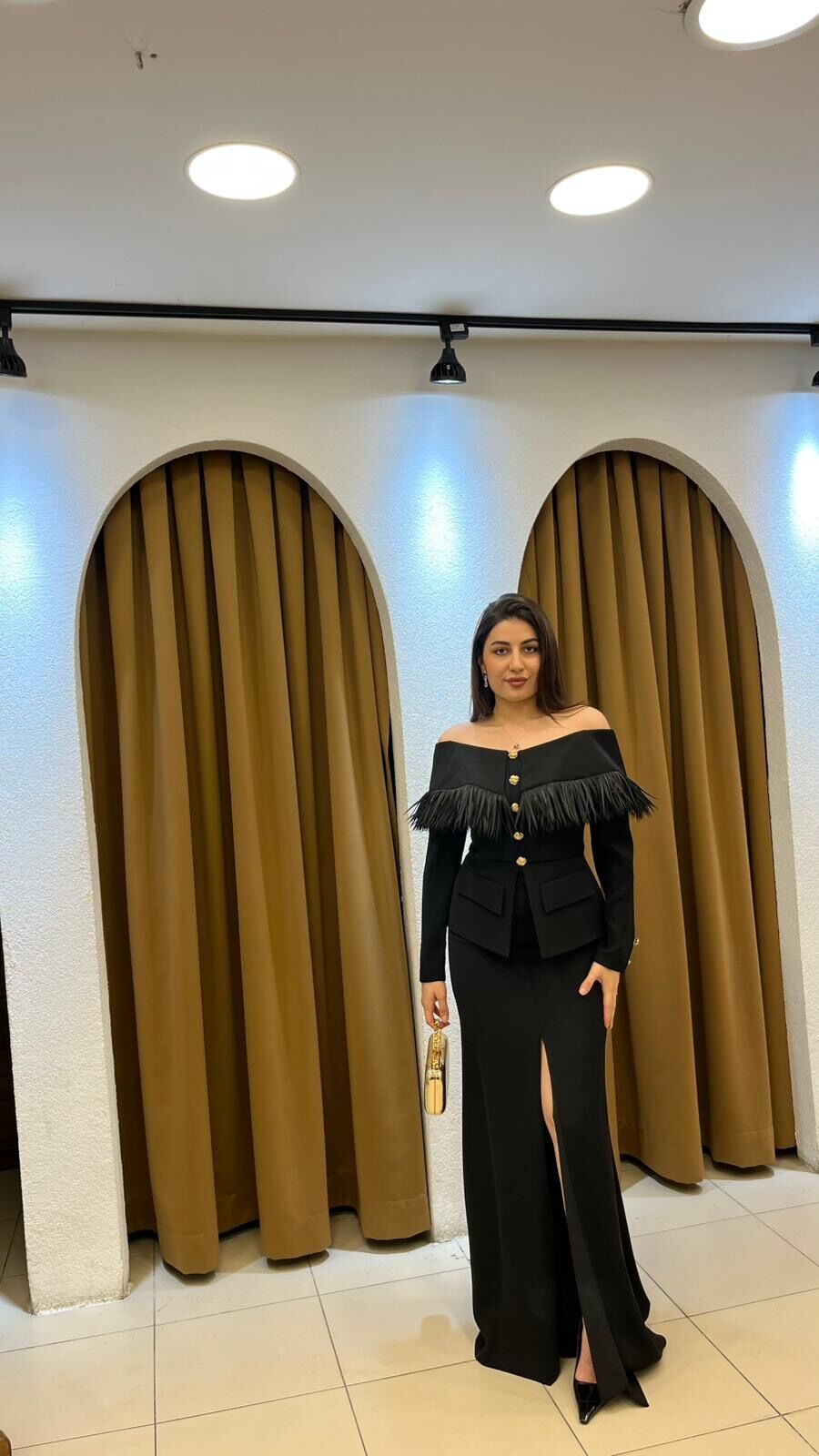 Siyah madonna yaka üstü korse detaylı tüylü detaylar gold düğmeli önden yırtmaçlı abiye