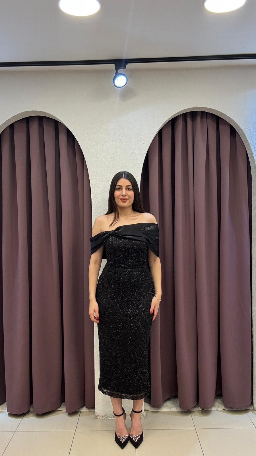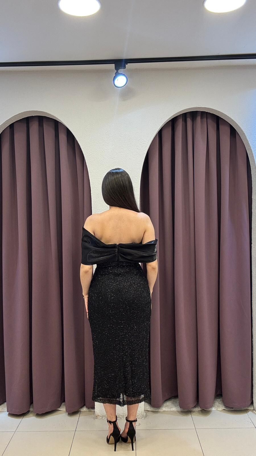 SİYAH MADONNA YAKA SATEN MİDİ BOY ABİYE ELBİSE SİYAH - 44