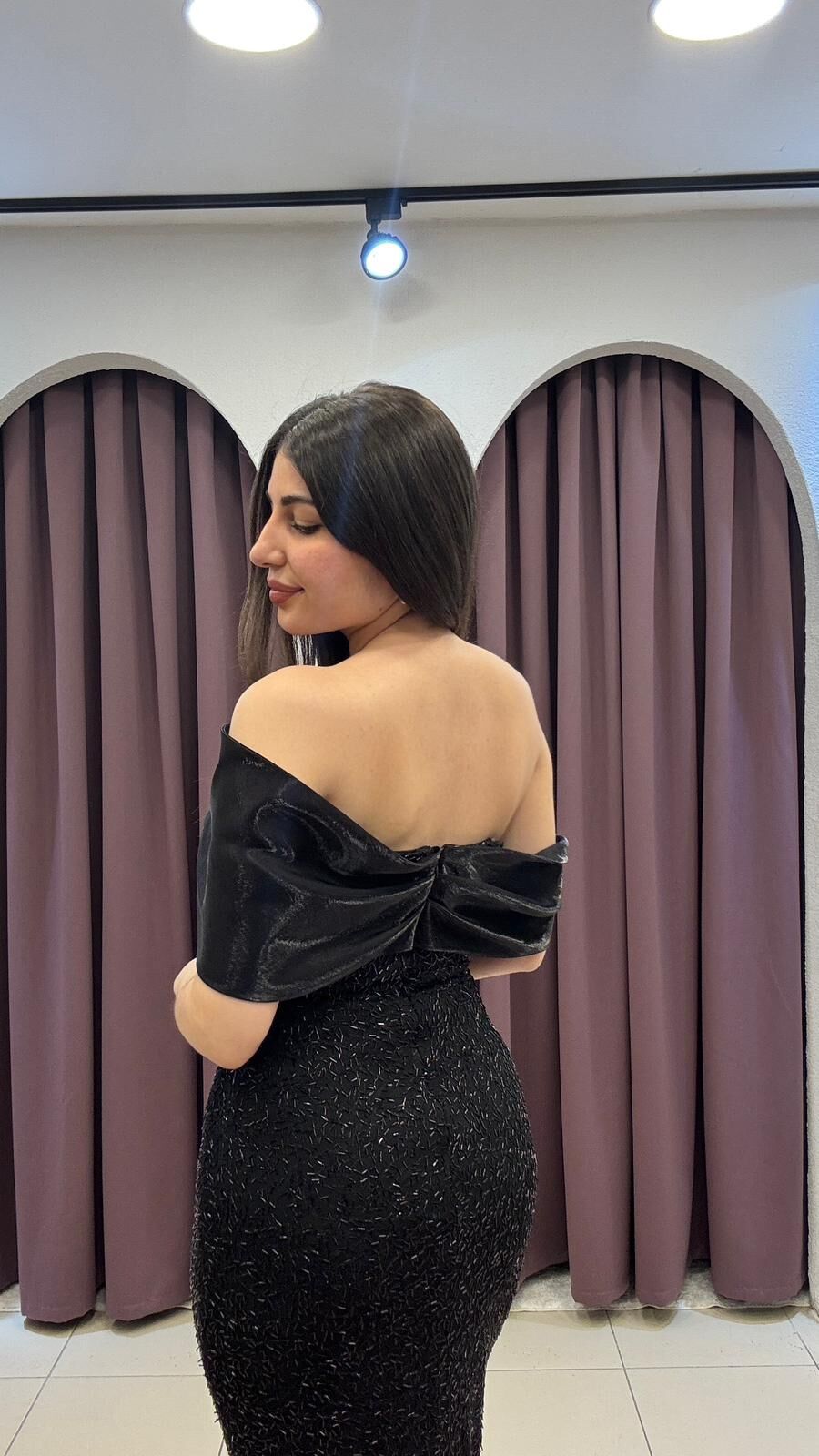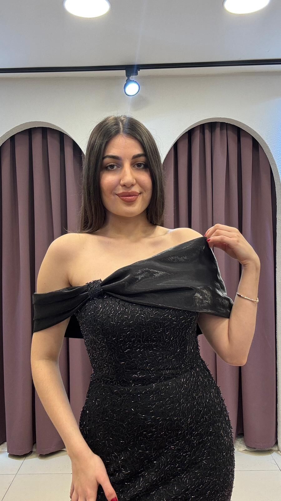 SİYAH MADONNA YAKA SATEN MİDİ BOY ABİYE ELBİSE SİYAH - 44 3339