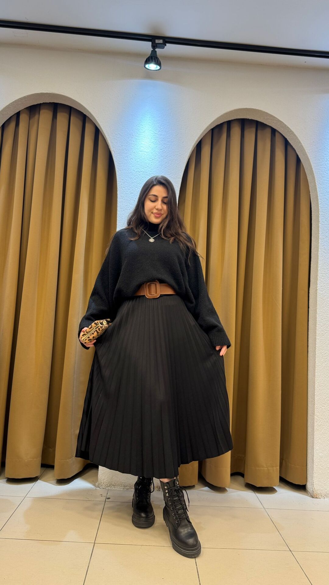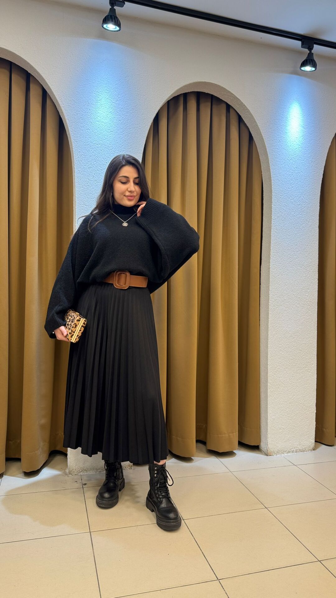 Detaylar: İnce pile işçiliği, gizli fermuar kapanış, astarlı iç yapı