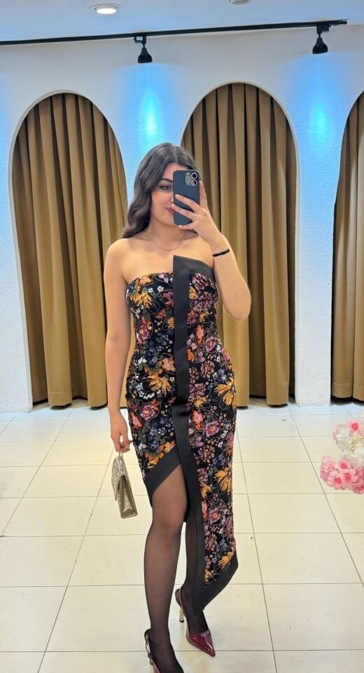 Asimetrik kesim payetli çiçek desenli straplez abiye elbise