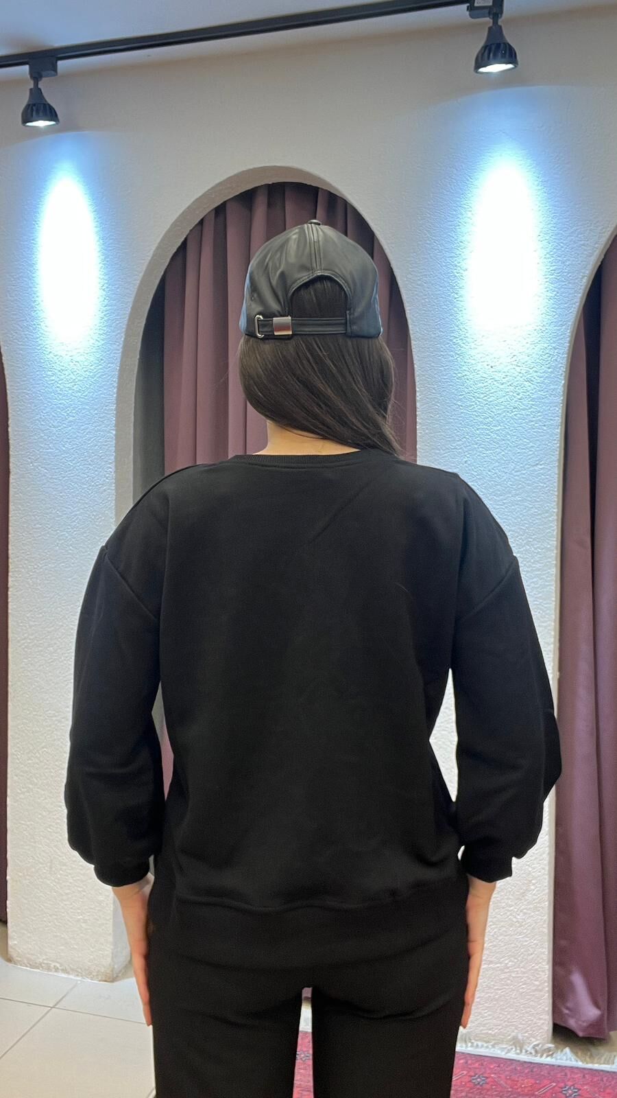 SİYAH YUVARLAK YAKA TAŞLI İPLİ SWEAT