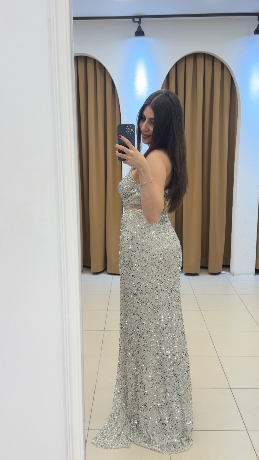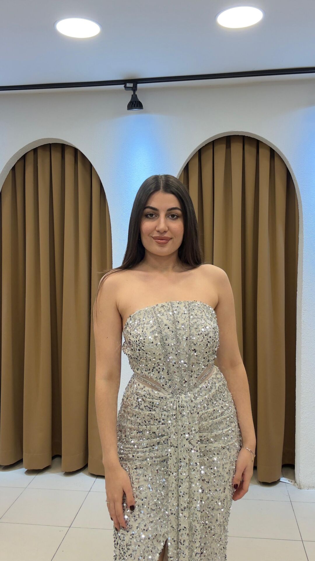 Model Özelliği: Straplez (Omuzları açık) ve tamamen payetlerle (pullarla) kaplı.