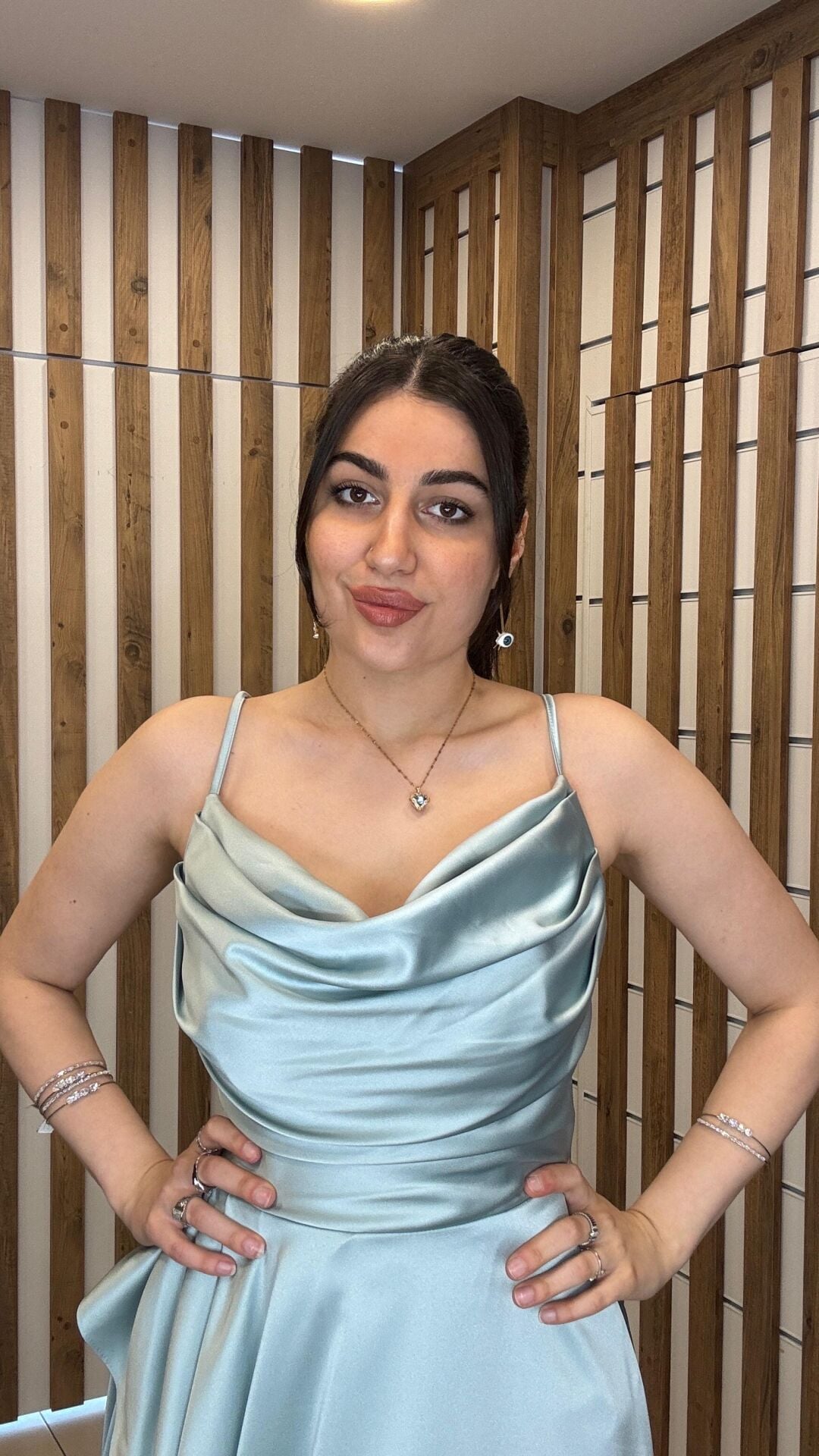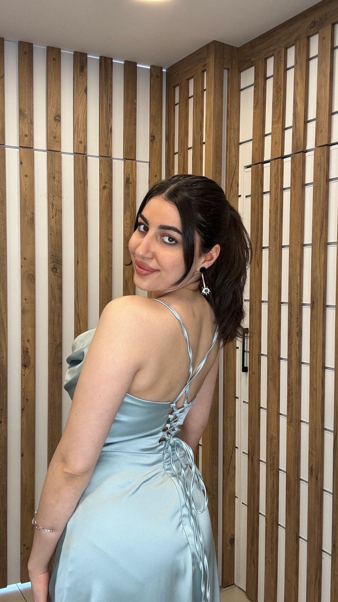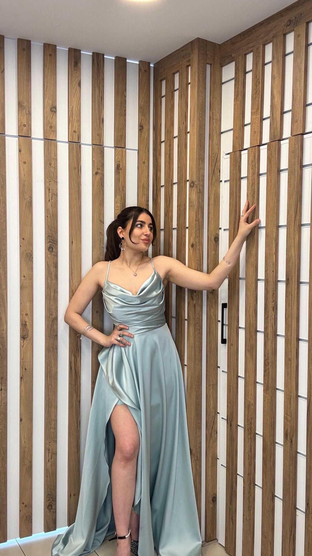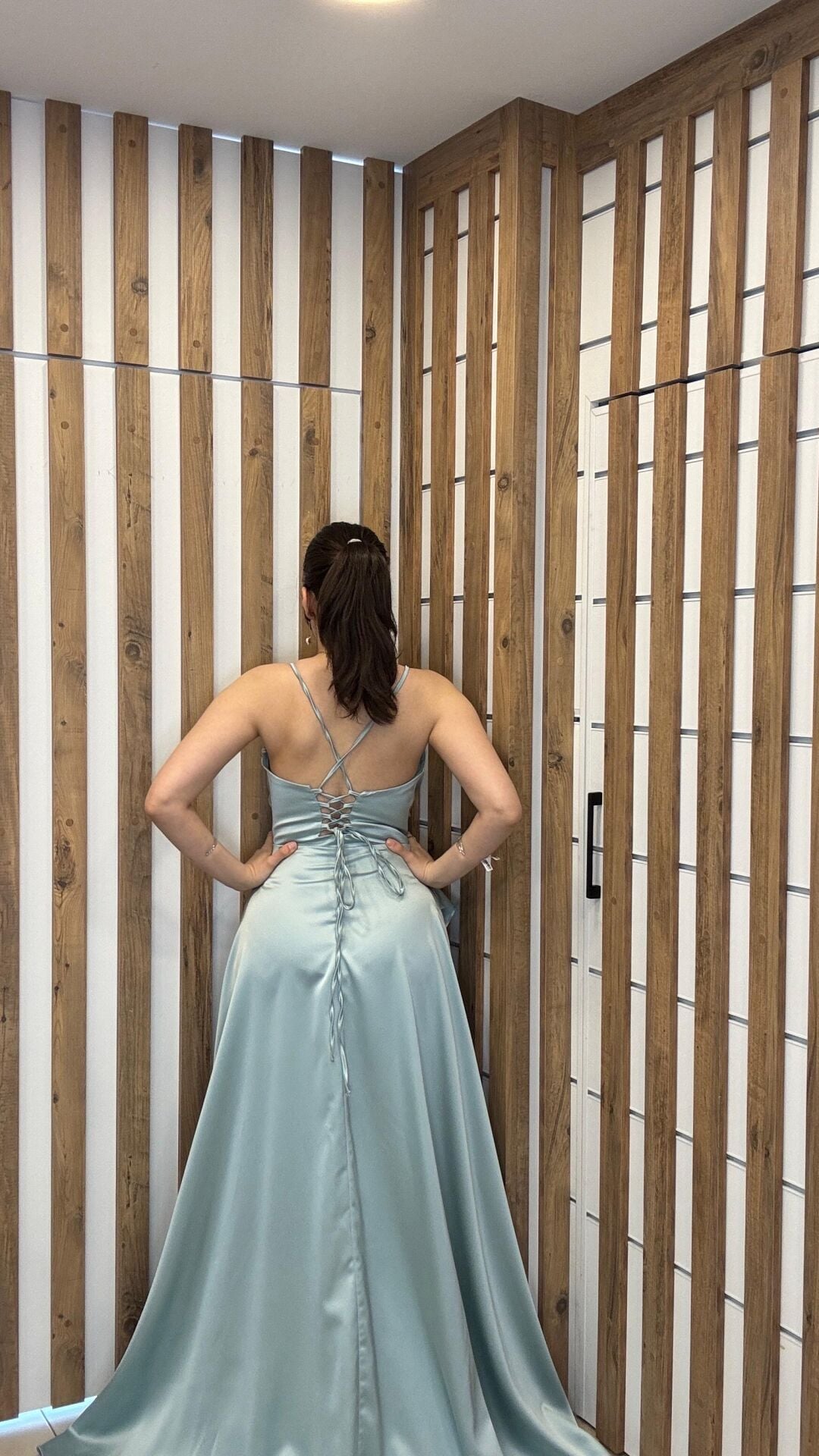 Su yeşili ip askılı sırt bağlamalı uzun yırtmaçlı abiye elbise 42