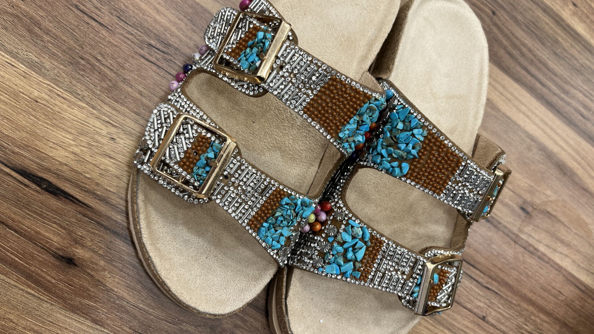 - Malzeme: Turkuaz renkli taşlar ve boncuklarla süslenmiş deri bantlar, bej taban.