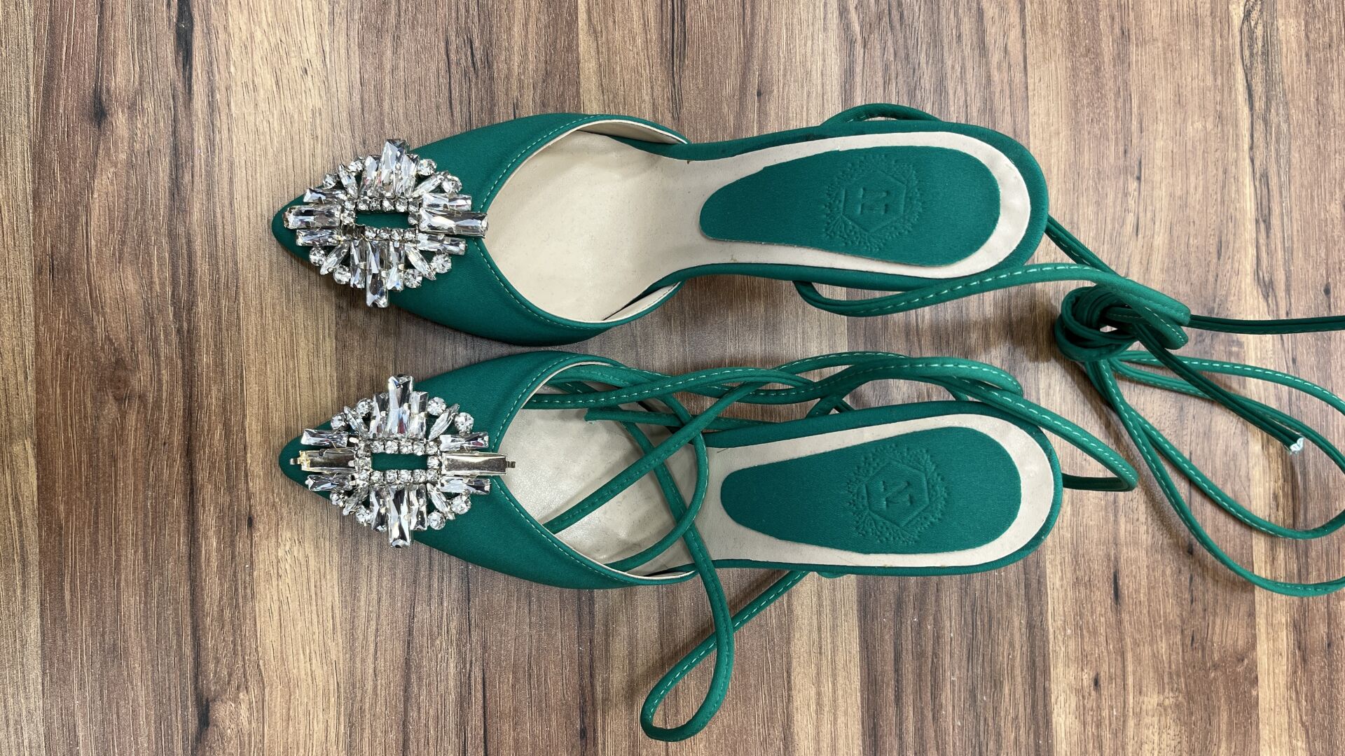 - Malzeme: Zümrüt yeşili saten üst kısım, uzun bağcıklar ile dizayn.