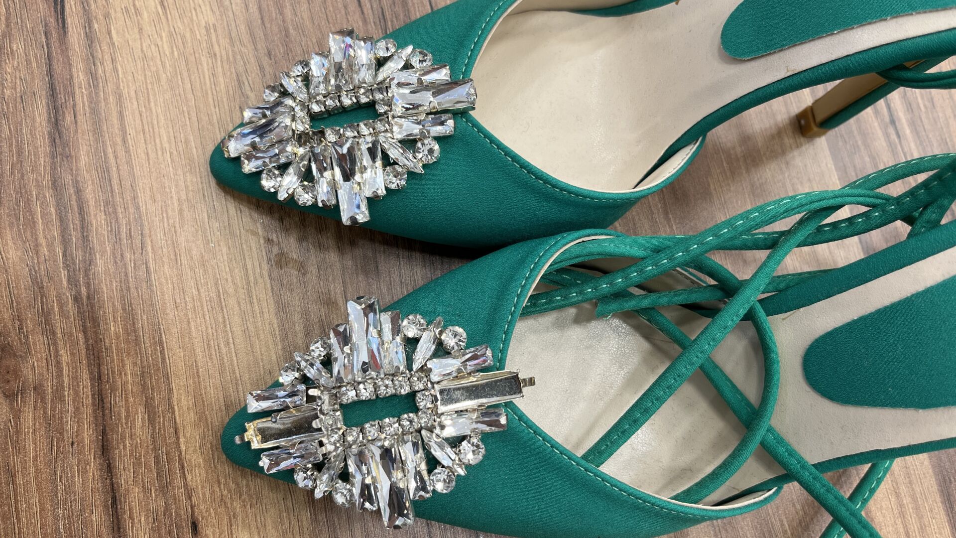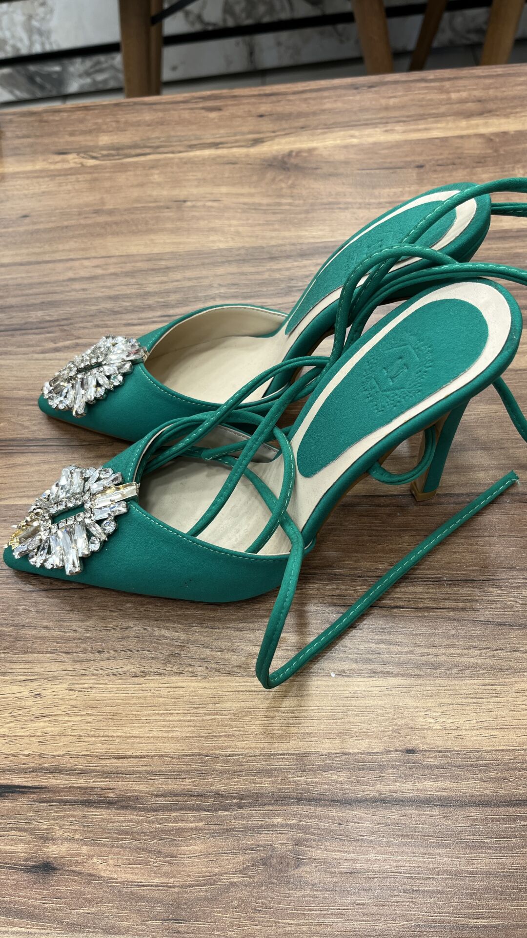 - Tasarım: Açık burunlu, bağcıklarla bileğe kadar uzanan zarif bir model. Bağcıkların üzerinde büyük taş süslemeler bulunuyor.