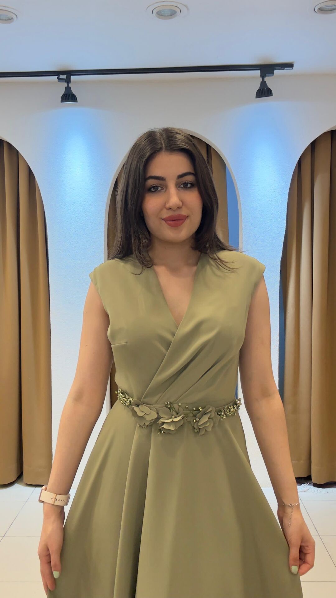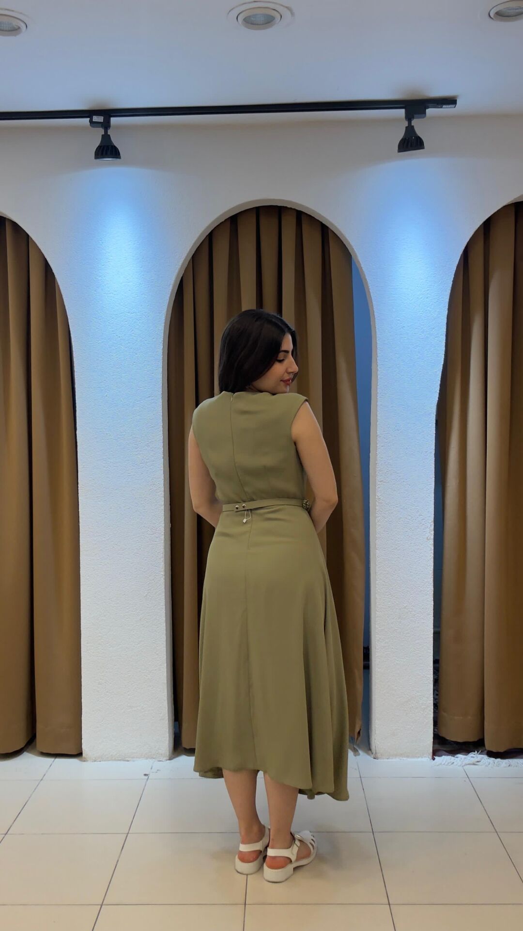 Yeşil midi boy kendinden kemerli midi boy elbise