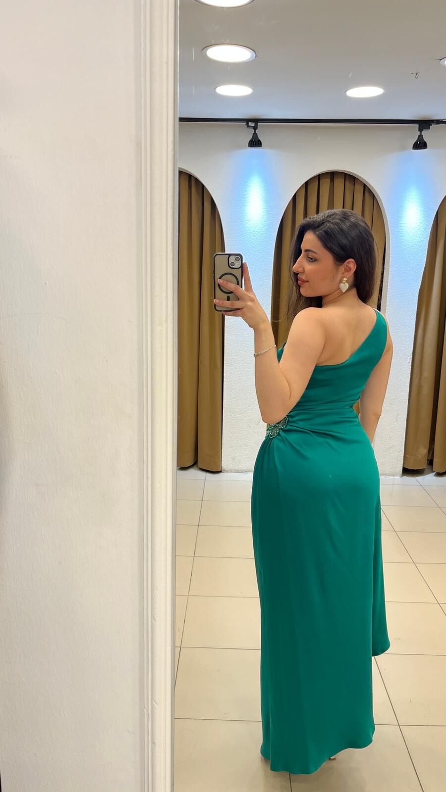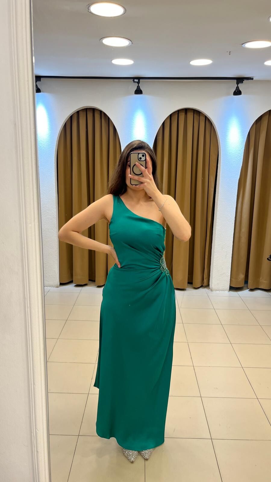 YEŞİL TEK KOL ASİMETRİK KESİM YANİ ÇİÇEK DETAY SATEN